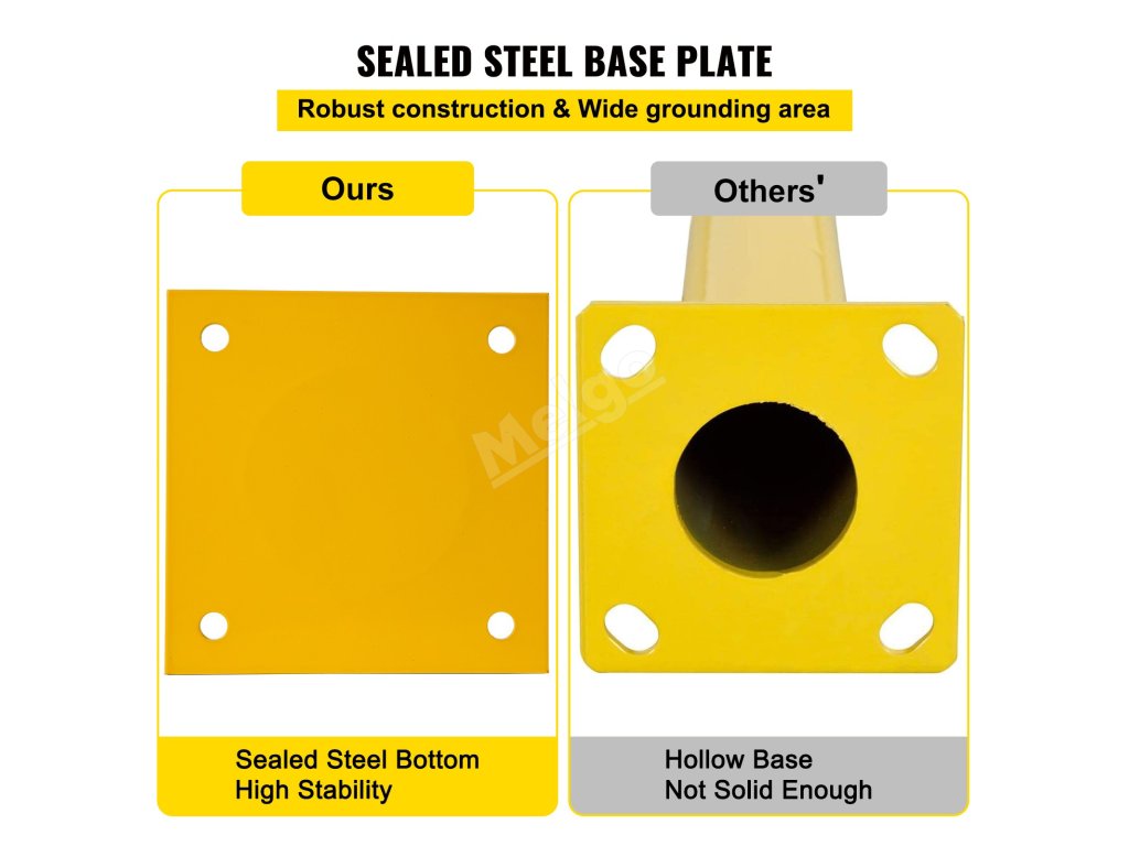 Trubka a čtvercová základová deska (každá strana: 7,87") tohoto ocelového bezpečnostního sloupku mají robustní a plně svařovanou konstrukci a jsou vzájemně těsně propojeny, aby byla zajištěna maximální pevnost a stabilita pro dlouhodobé používání.