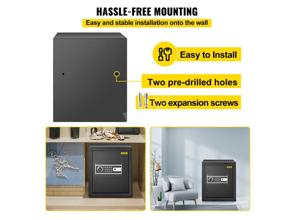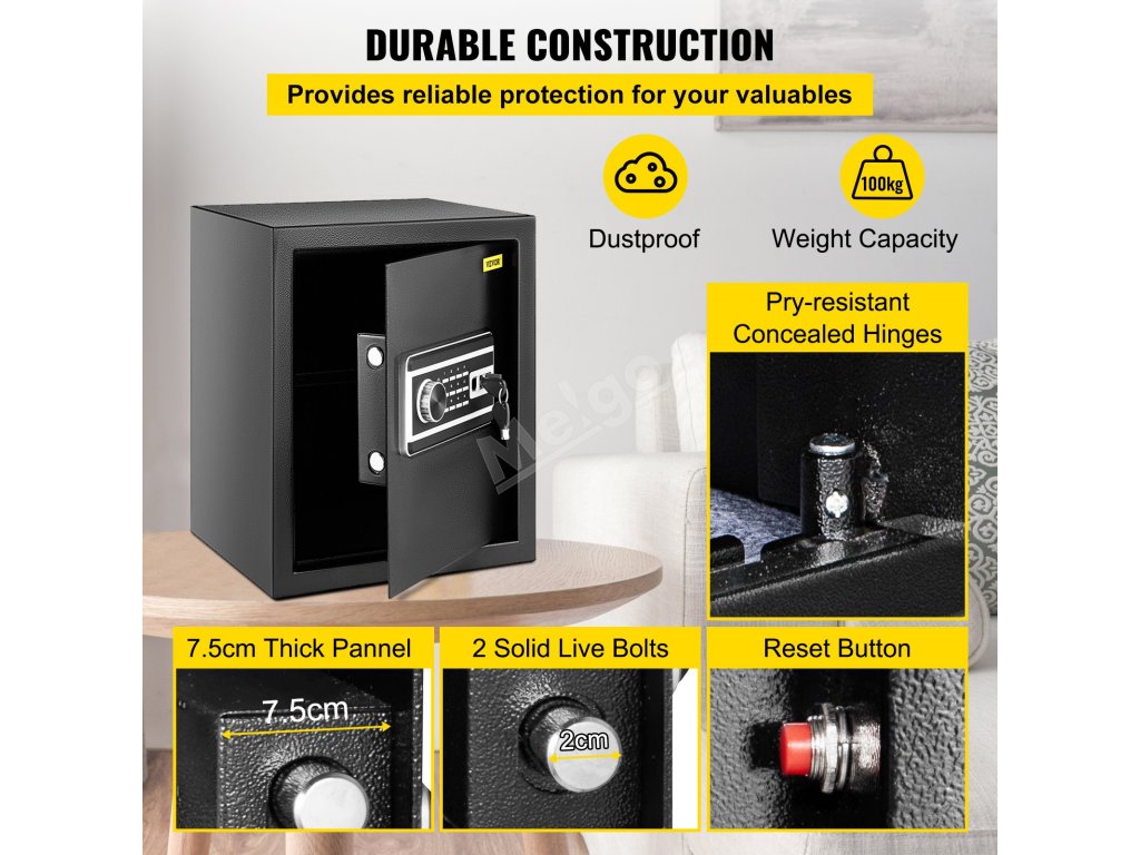 Tato bezpečnostní schránka je vyrobena z 1,2 mm silného, prachuvzdorného, pevného ocelového plechu Q235 a má nosnost až 33 liber/15 kg pro uložení mnoha cenností. Dodatečnou ochranu vašich věcí může poskytnout také koberec.