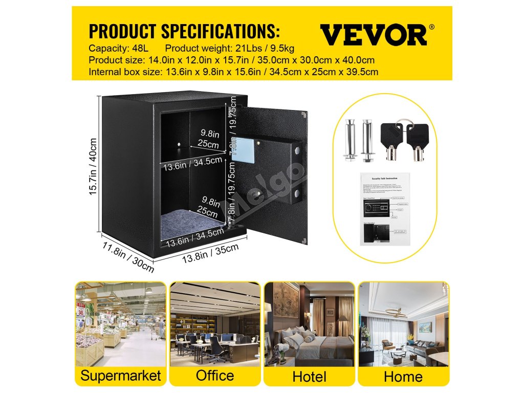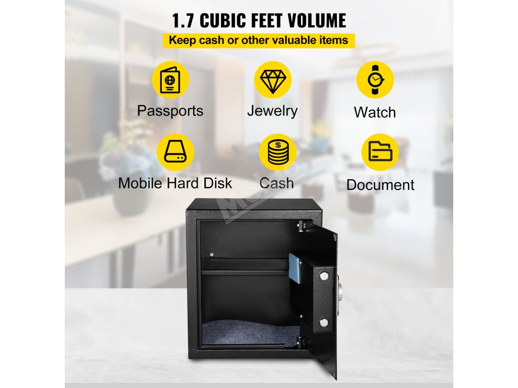 Objem bezpečnostní schránky pro domácnost je 1,7 stopy krychlové. Úložný prostor s odnímatelnou policí je vhodný pro uložení hotovosti, fotoaparátu, dokumentů, hodinek, pasů, šperků, mobilního pevného disku atd. Trezor splní všechny vaše každodenní potřeby pro ukládání dat.