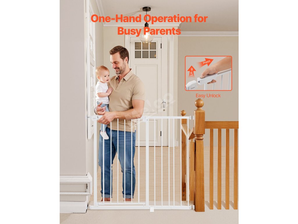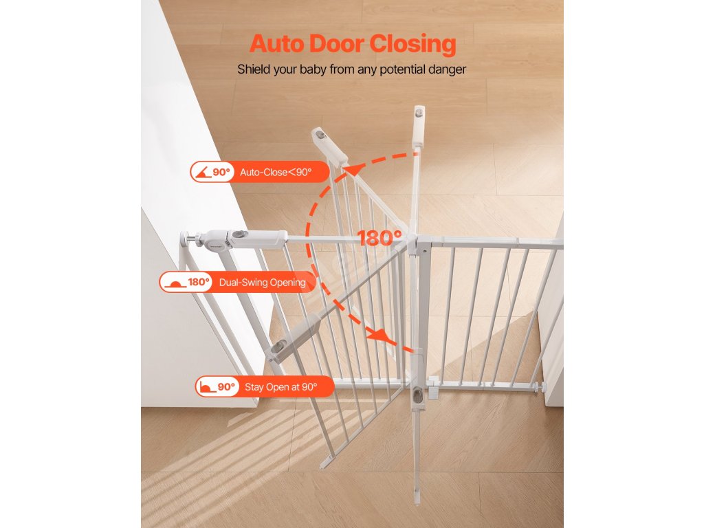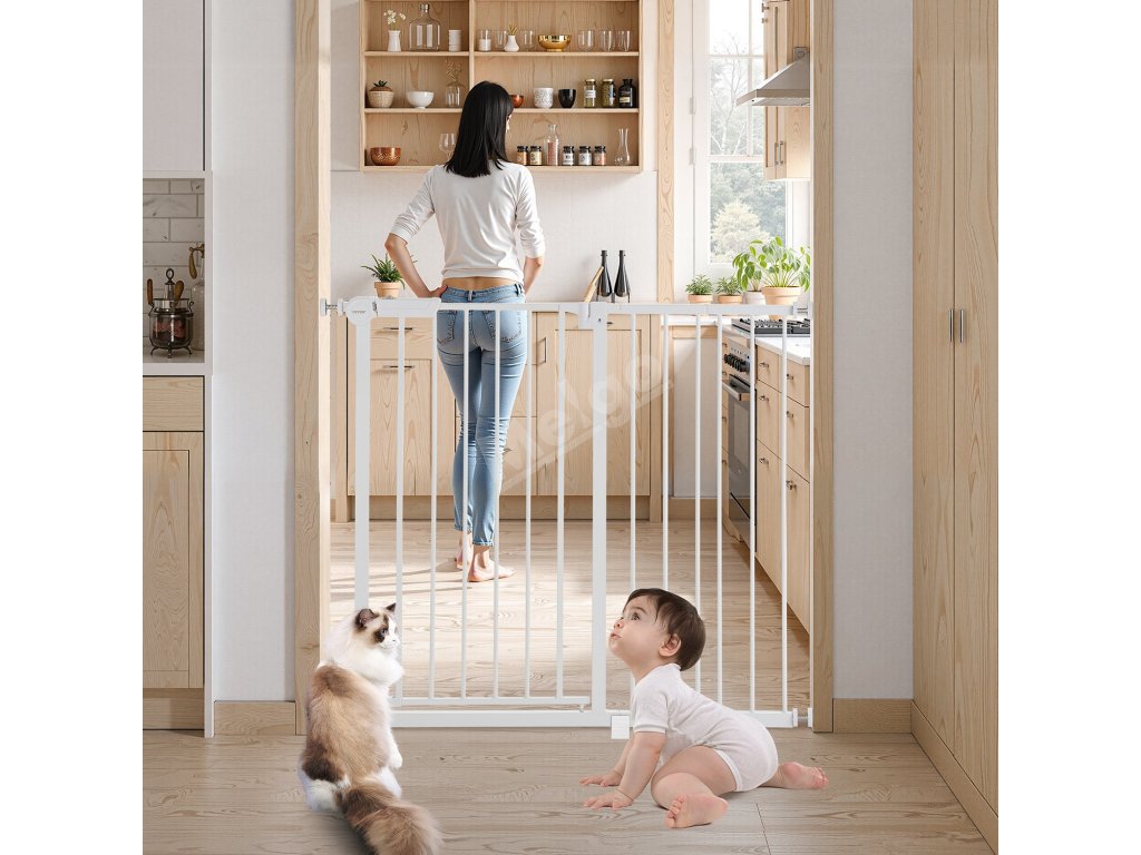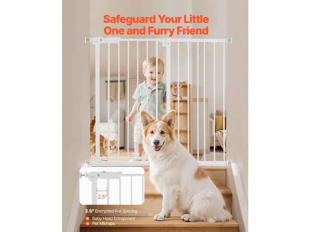 Díky úzkým rozestupům 2,5" tyčí brána pro psy účinně zabraňuje tomu, aby děti strkaly hlavu do mezer, a snižuje tak riziko zranění. Zabraňuje také domácím zvířatům protáhnout se skrz mříže, čímž zajišťuje bezpečnost dětí i domácích mazlíčků.