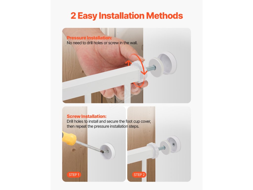 Tato dětská branka má inovativní konstrukci pro tlakovou montáž, která nevyžaduje vrtání, přibíjení ani použití nástrojů, které by mohly při instalaci poškodit stěny, a zachovává tak vaše stěny neporušené. Vytváří bezpečné prostředí pro vaše dítě a zajišťuje bezpečnost pro váš klid!