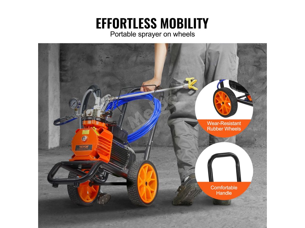 Konstrukce na kolečkách usnadňuje přesun elektrického bezvzduchového postřikovače na požadované místo bez nutnosti zvedání. Tato funkce je obzvláště užitečná v rozsáhlých nebo často se měnících pracovních prostředích. Přiložená čisticí jehla a kartáček dále zjednodušují údržbu a čištění.