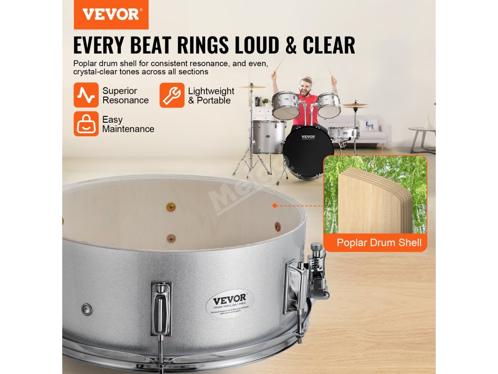 Naše bicí souprava pro dospělé nabízí rezonující tóny, které přesahují plastové bubny. Hlavice našich bubnů jsou vyrobeny z prvotřídního topolu, který dodává zvuku hloubku a bohatost. Silná bubenická hlava z PET navíc vydrží náročné podmínky neustálého hraní a častého používání, aniž by vynechala jediný úder.