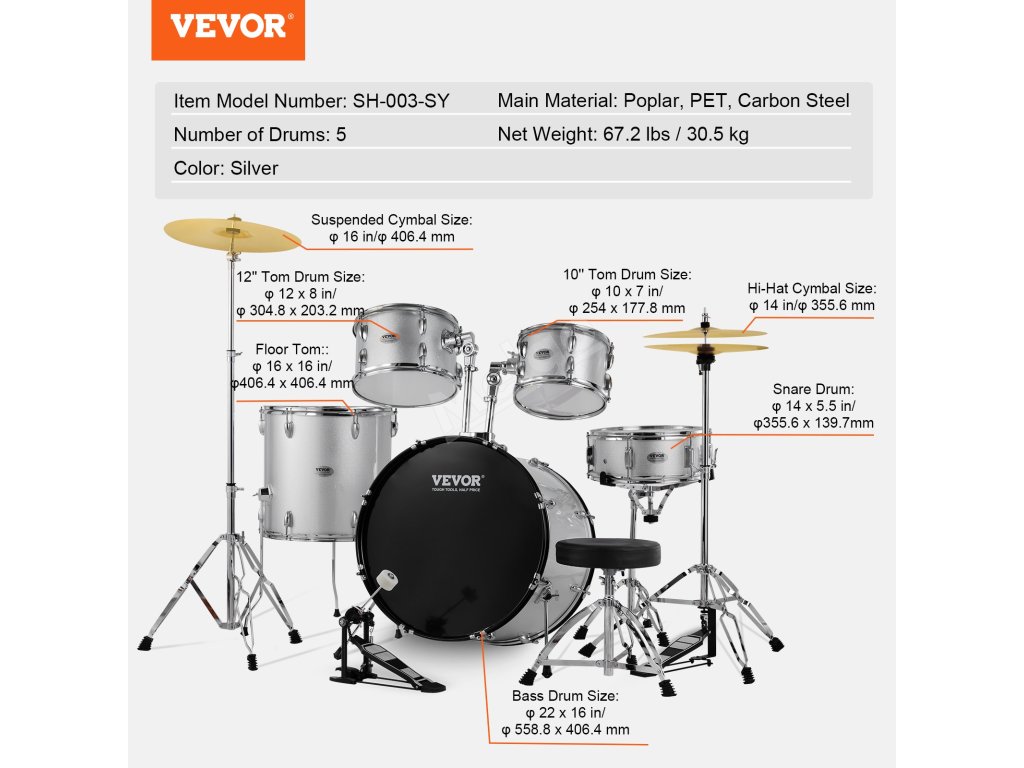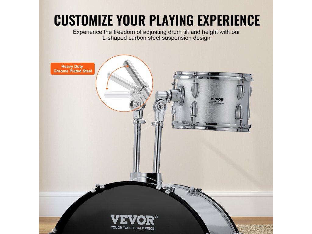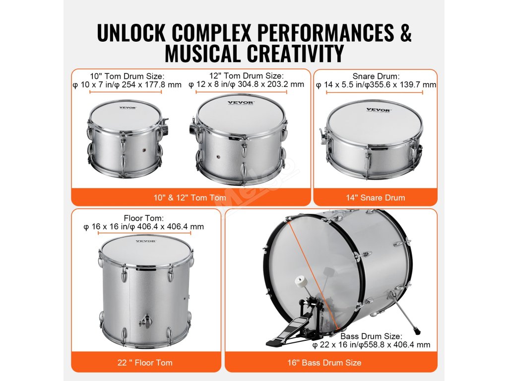 Naše bicí souprava pro dospělé obsahuje 10'' tom tom, 12'' tom tom, 14'' snare buben, 22'' basový buben a 16'' floor tom. Díky topolovému korpusu a PET bubenické hlavici mají naše bubny čistý a dynamický zvuk. Pozvedněte svou bubenickou cestu ještě dnes!