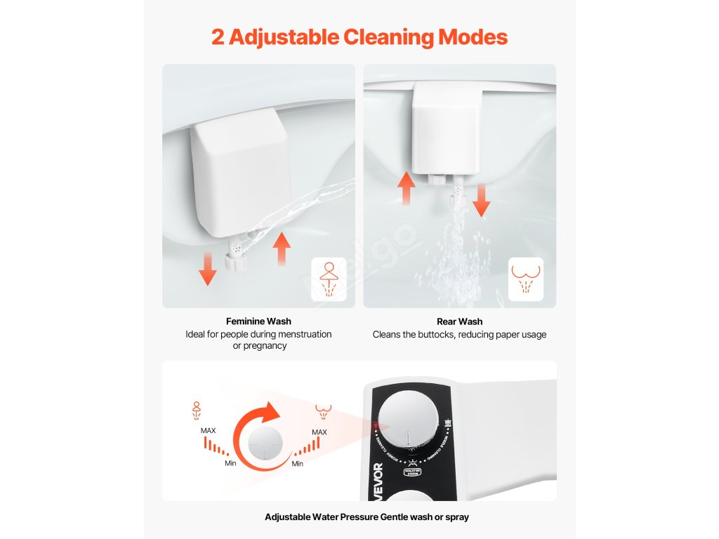 Tento bidetový nástavec na toaletu je vybaven dvěma tryskami pro přední a zadní mytí. Ženský režim nabízí jemnou péči, ideální pro osoby během menstruace nebo těhotenství