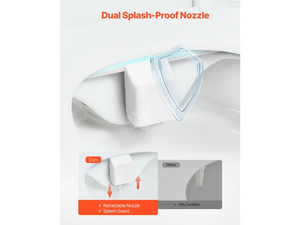Tento bidetový nástavec je vybaven výsuvnou tryskou a ochranou proti stříkající vodě. Když se tryska nepoužívá, automaticky se zasune za ochranný kryt, takže zůstane čistá a chráněná před znečištěním.