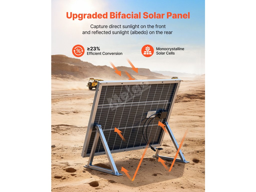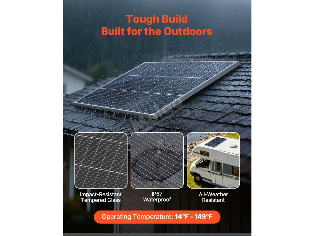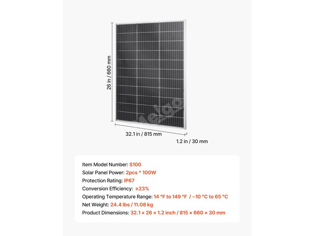 Monokrystalický solární panel VEVOR 2PCS 100 W nabízí účinnost konverze ≥ 23 %, stabilní výstup MC4, ochranu IP67 a odolný rám. Spolehlivě funguje v různých prostředích a poskytuje stabilní napájení pro automobily, obytné vozy, lodě, farmy, chaty a aplikace mimo síť.