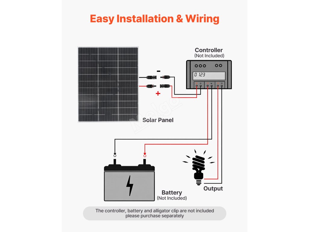 Tento monokrystalický solární panel s integrovaným kabelem MC4 umožňuje snadné připojení k regulátoru a baterii pro stabilní napájení. (Regulátor, baterie a krokové svorky NEJSOU součástí dodávky.)