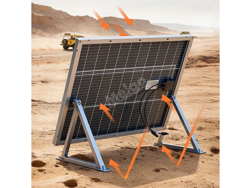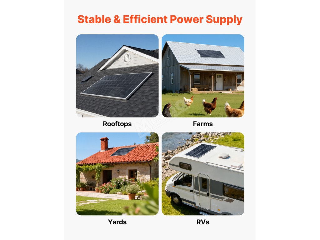 Tento solární panel má odolný rám, takže je ideální pro dlouhodobou instalaci na ploché střechy, střechy domů, farmy, dvory nebo karavany, kde poskytuje stálou a spolehlivou energii. (Montážní držáky NEJSOU součástí dodávky.)