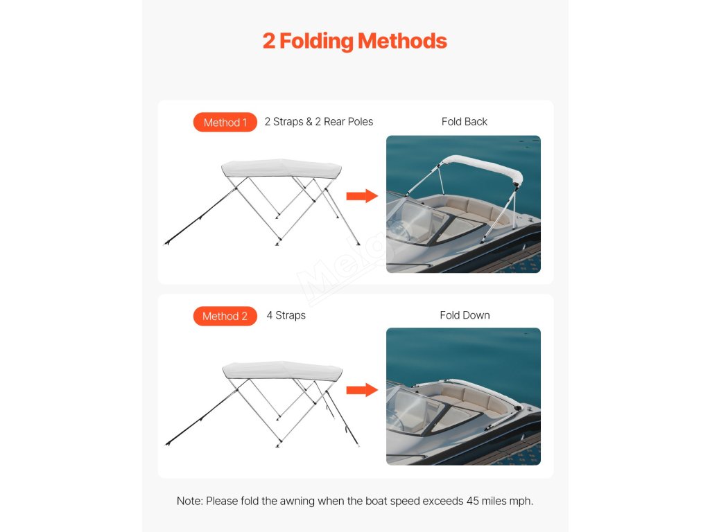 Pro montáž markýzy na loď si můžete vybrat ze dvou způsobů instalace, které umožňují sklápění směrem dolů i dozadu. Dodávané popruhy s rychloupínacími přezkami umožňují rychlé a snadné nastavení.