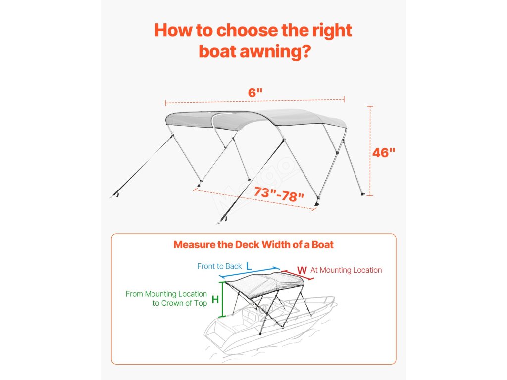 Bimini na člun 3 oblouky 600D hliníkový rám, 72"×(73"-78")×46"