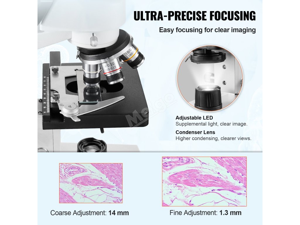 Binokulární mikroskop vybavený mimořádně přesným zaostřovacím systémem nabízí přesné a plynulé zaostřování díky hrubému i jemnému nastavení.