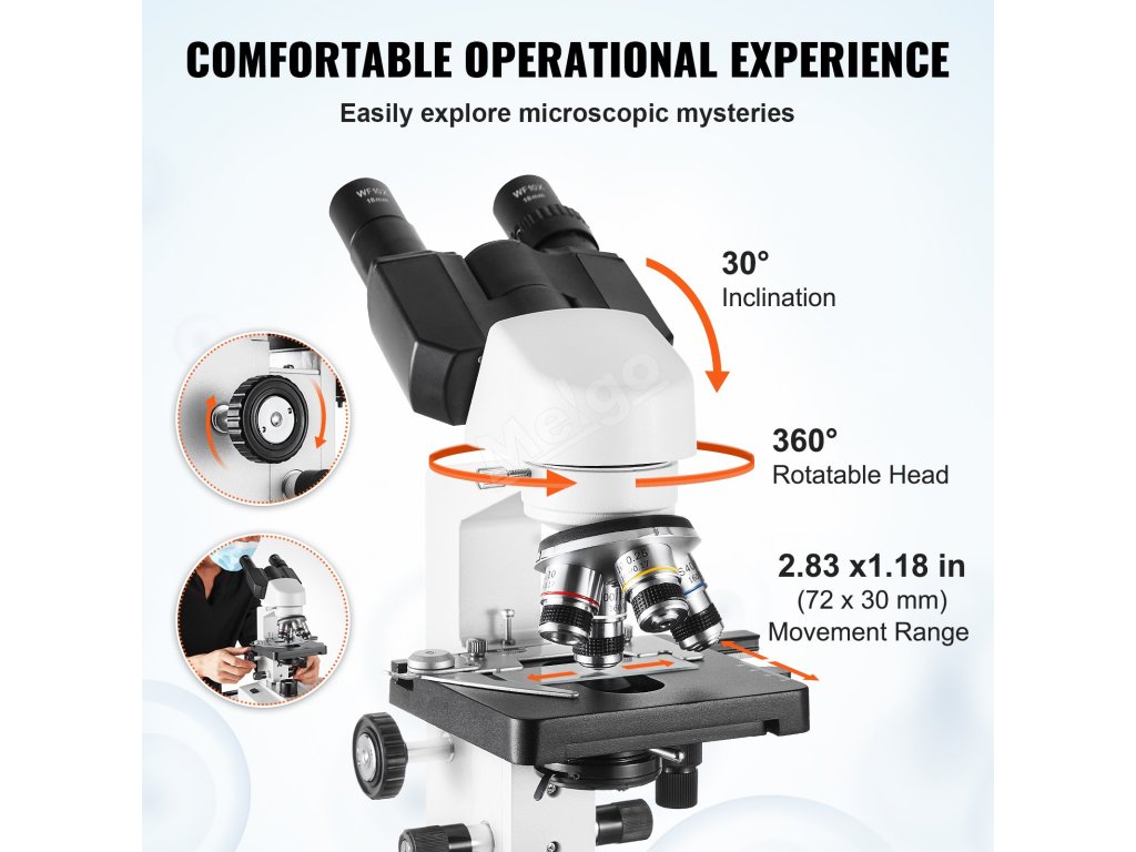 Dvouvrstvý stolek zjednodušuje fixaci vzorku a otočná prohlížecí hlava zvyšuje pohodlí. Zaostřovací knoflíky se řídí ergonomickými zásadami a umožňují snadné nastavení ohniska pro pohodlnější a komfortnější používání.