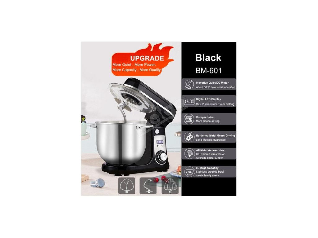 BioloMix BM601 je vybaven 6litrovou mísou z potravinářské nerezové oceli se dvěma držadly pro pohodlnější uchopení a dokáže efektivně obsloužit rodinné setkání 8-10 osob. Má také šlehací metlu z tvrzeného kovového drátu, nadměrně velký hnětací hák na těsto potažený teflonem a plochý šlehač.