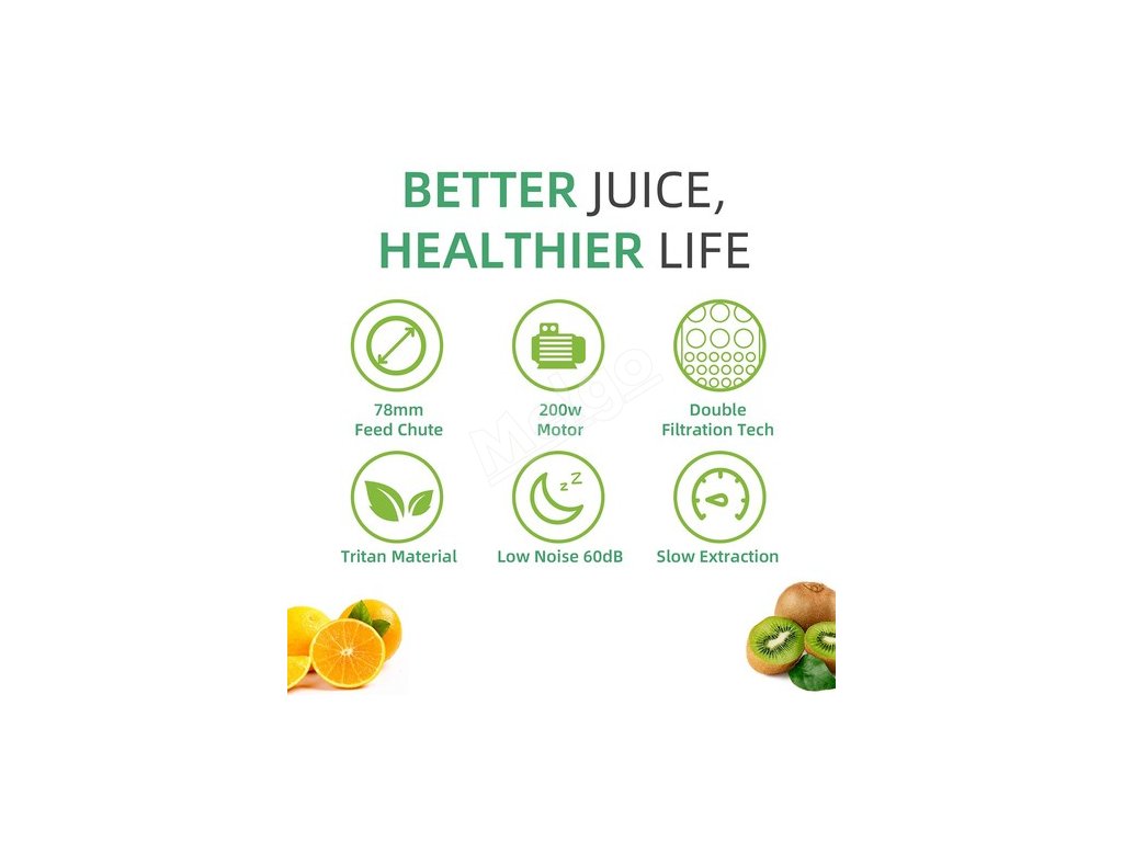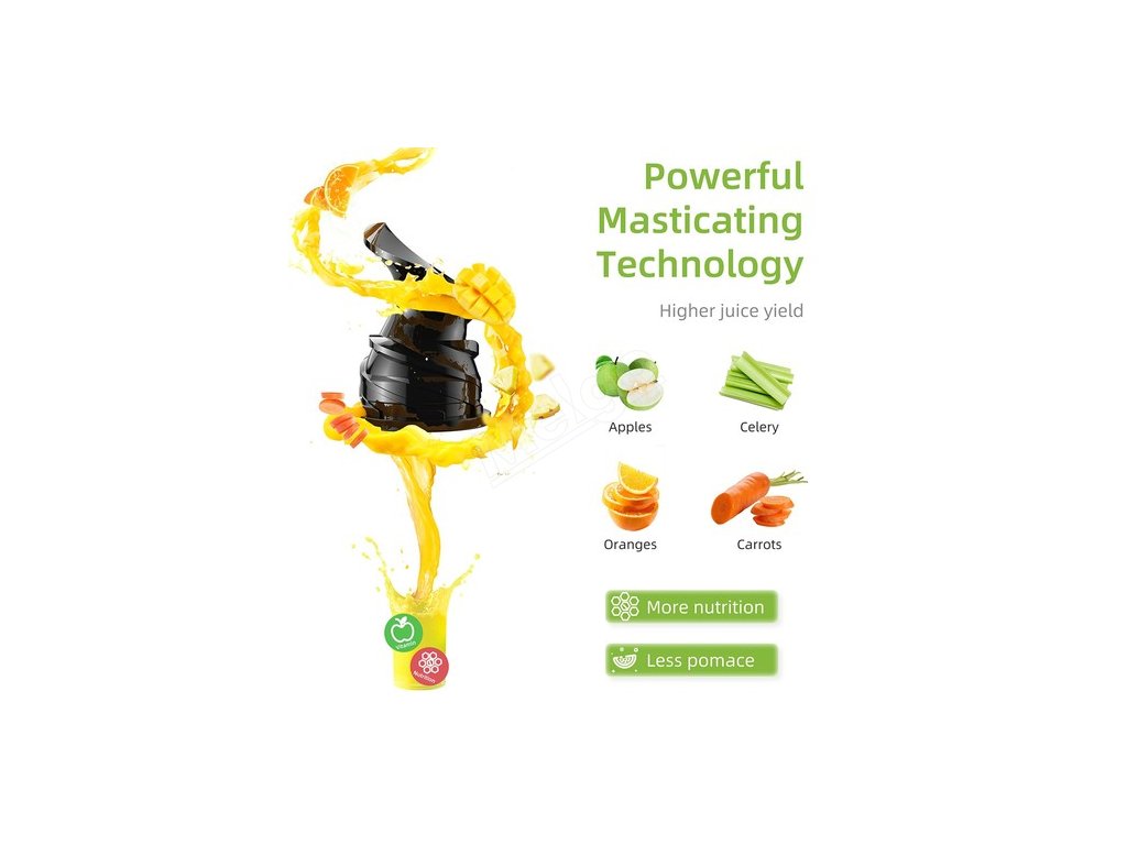 | Specifikace | Výkon 200W Napětí: 110-120V~/60Hz, 220-240V≈/50-60Hz Objem nádoby na šťávu: 800 ml Objem nádoby na buničinu: 600 ml Rychlost otáčení: 40- 65 otáček za minutu |