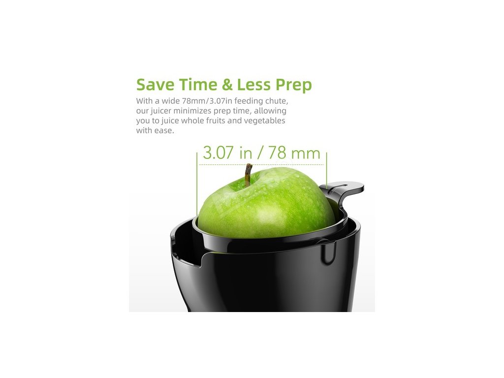 S 78 mm širokou vstupní trubkou ušetříte čas a námahu díky našemu širokému vstupnímu žlabu. můžete snadno odšťavňovat celé ovoce a zeleninu, aniž byste je museli krájet na menší kousky. užijte si pohodlné a efektivní odšťavňování.
