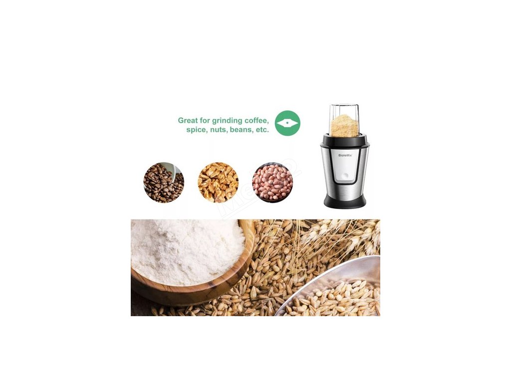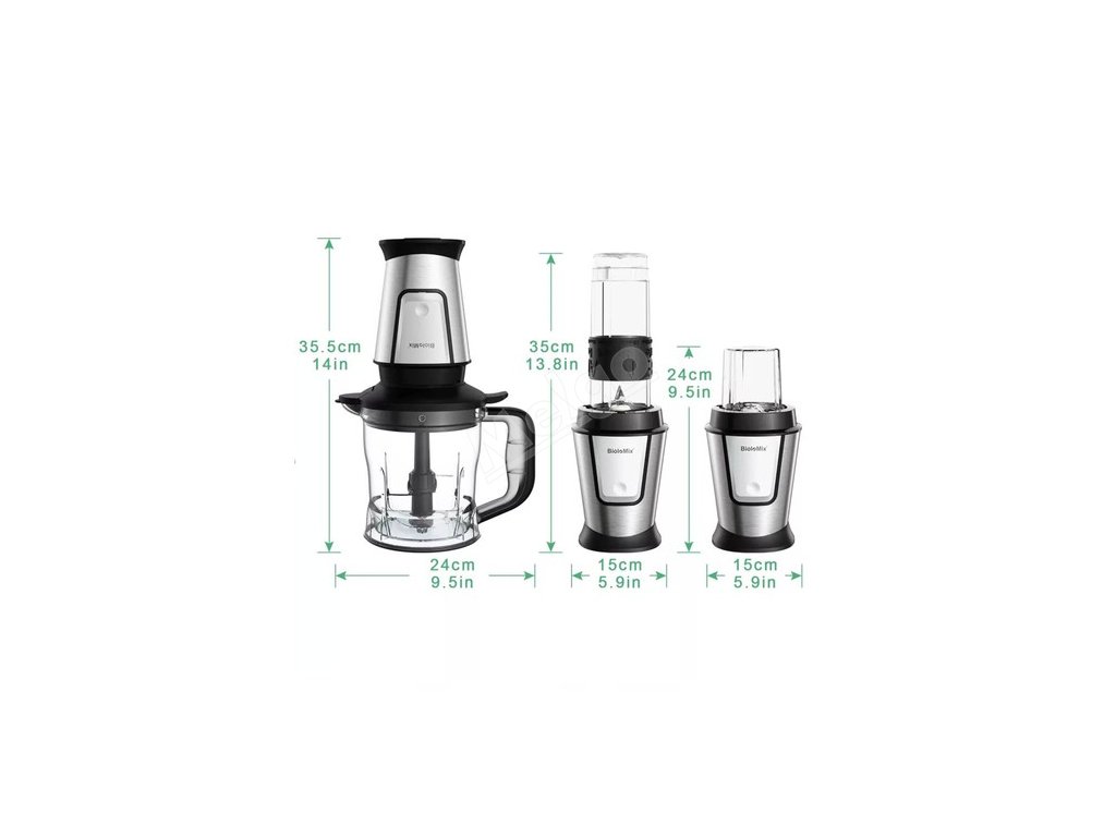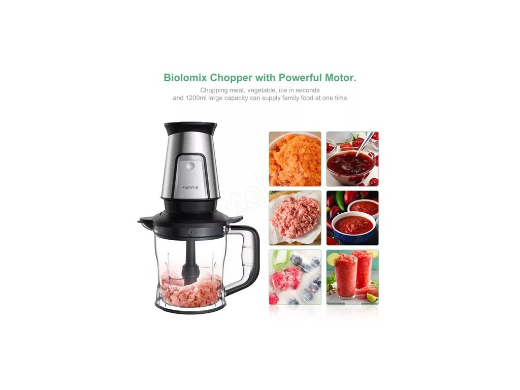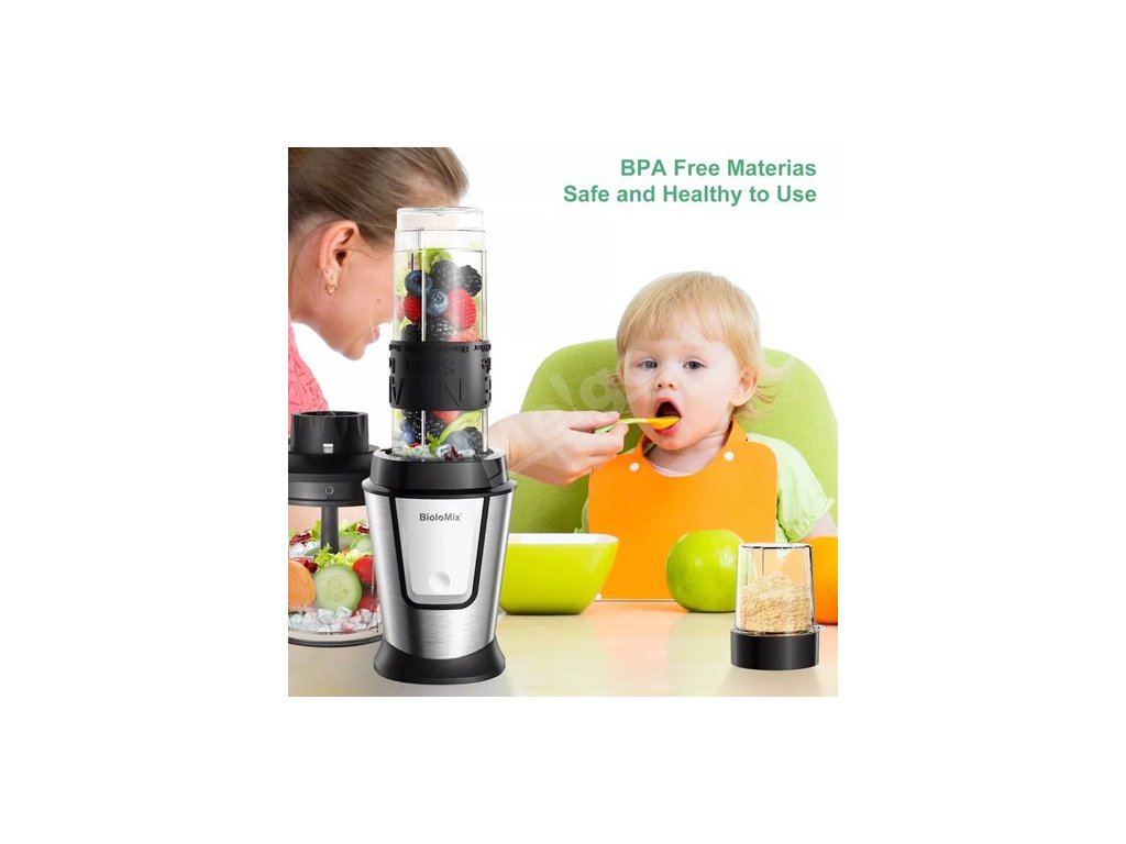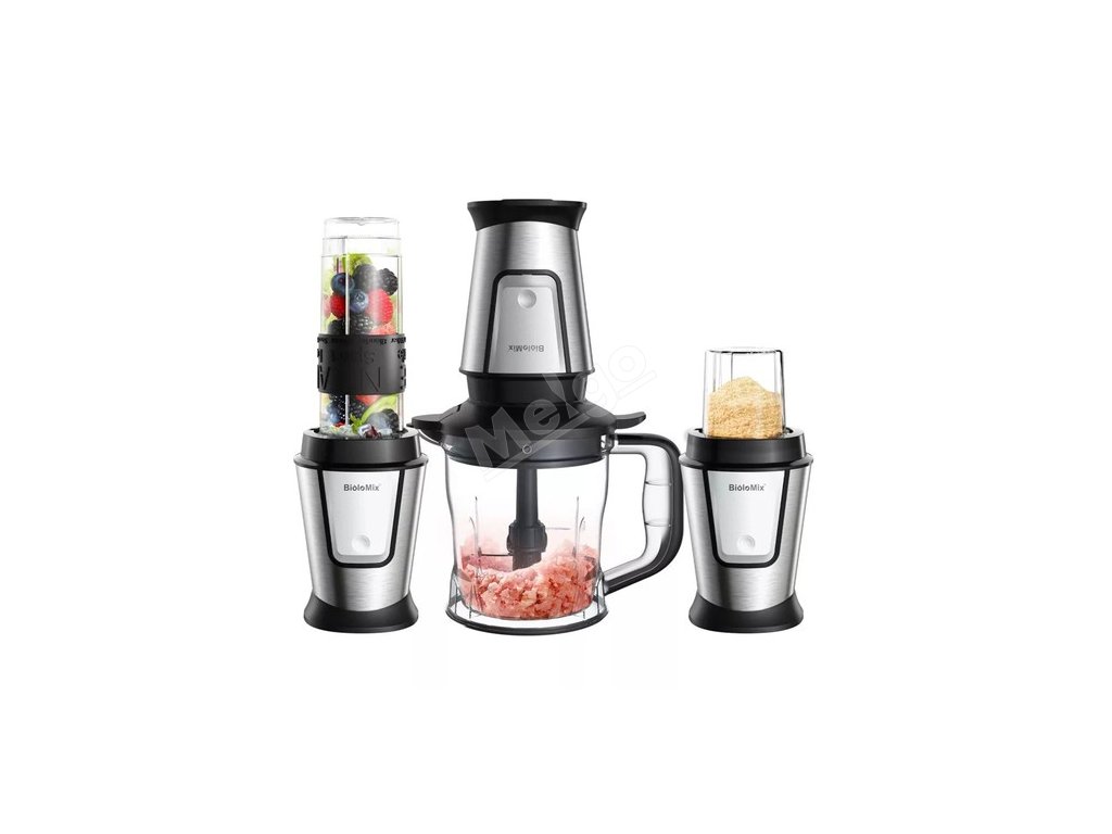 Mixér BioloMix je džbánkový mixér, sekáček a mlýnek v jednom a je dodáván s 600ml mixovací lahví, 1200ml sekací mísou a 100ml ml mlýnkem.