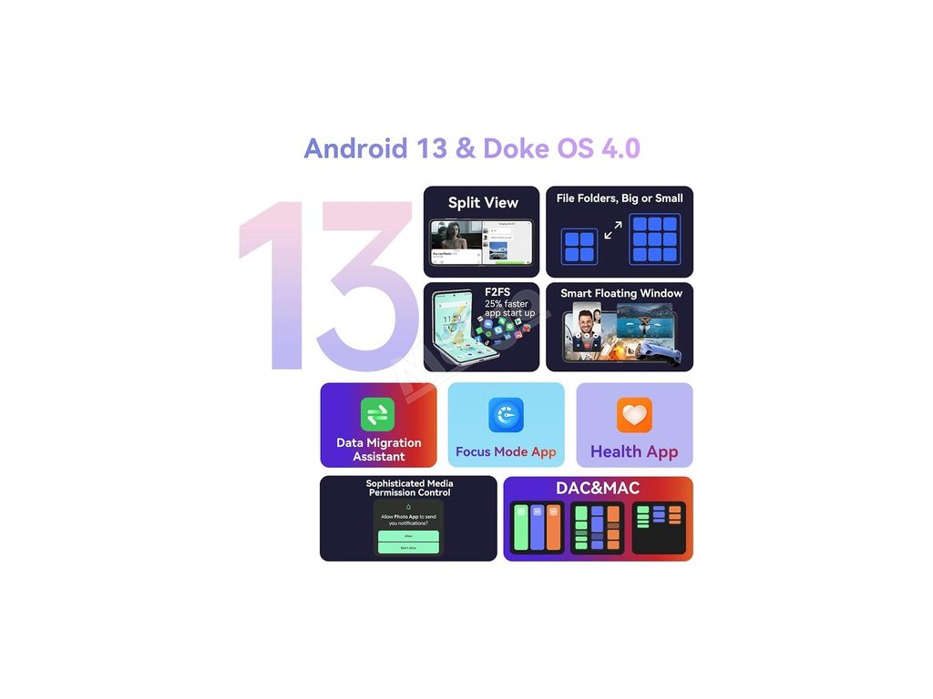 Systém Android 13 umožňuje v základním nastavení zkontrolovat a nastavit oprávnění používaná aplikacemi, aby se zabránilo narušení soukromí. V návaznosti na zabezpečení systému Blackview představuje Doke OS 4.0, který vylepšuje uživatelské prostředí a funkce. Nabízí přizpůsobitelné motivy a ikony, nástroje pro venkovní použití, plánování hardwarových prostředků a další funkce