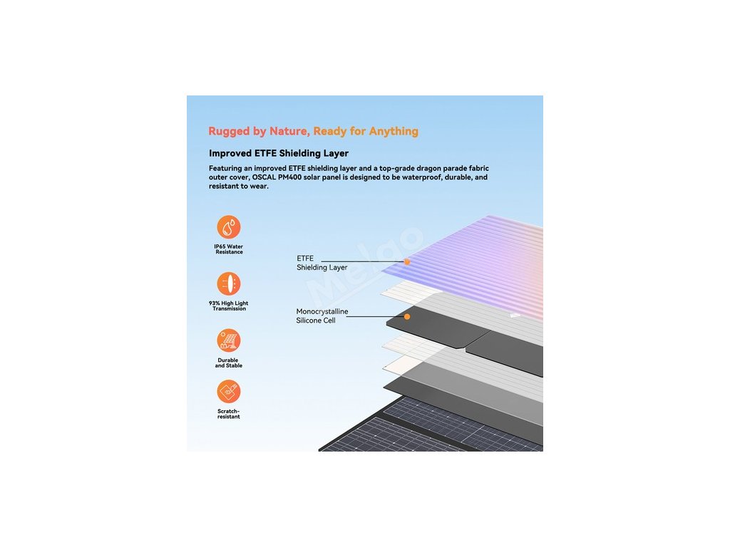 Solární panel OSCAL PM400 s vylepšenou stínicí vrstvou ETFE a vnějším potahem z prvotřídní tkaniny Dragon Parade je navržen tak, aby byl vodotěsný, odolný a odolný proti opotřebení.