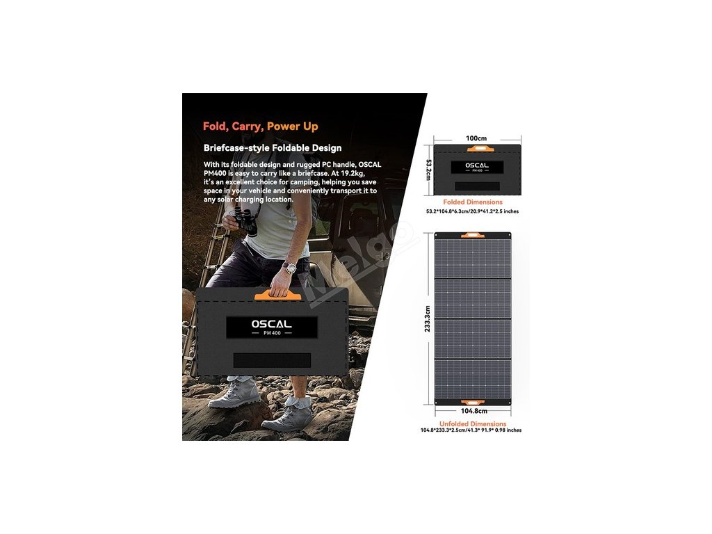 Díky skládacímu kufříkovému designu a odolné rukojeti z PC se OSCAL PM400 snadno přenáší a přepravuje. S hmotností pouhých 19,2 kg je vynikající volbou pro kempování, pomůže vám ušetřit místo ve vozidle a díky solárnímu nabíjení jej můžete pohodlně přepravit na libovolné místo.