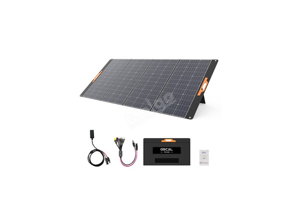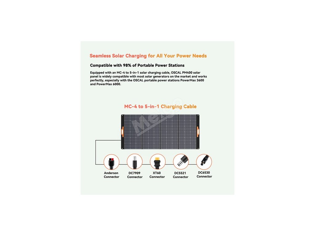 Solární panel OSCAL PM400, vybavený solárním nabíjecím kabelem MC-4 5 v 1, je široce kompatibilní s většinou solárních generátorů na trhu a dokonale spolupracuje zejména s přenosnými elektrárnami OSCAL PowerMax 3600 a PowerMax 6000.