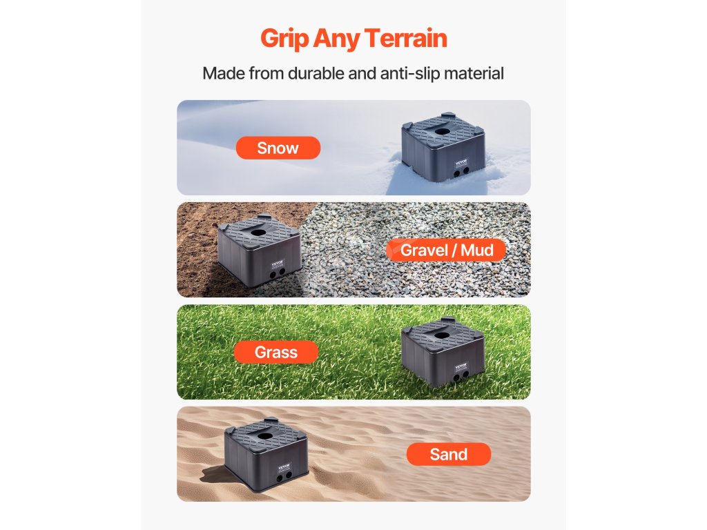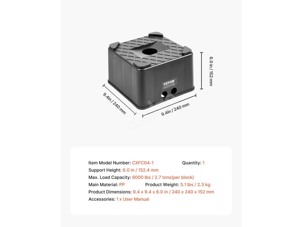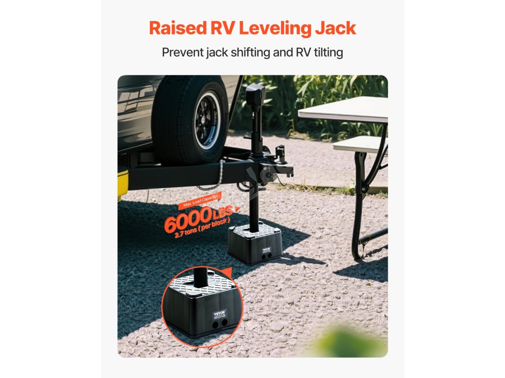 Tento blokový zvedák pro obytné vozy s nosností až 6 palců a hmotností až 6 000 liber (na blok) je stohovatelný a odolný, ideální pro obytné vozy a přívěsy třídy A a C. Použijte jej jako vyrovnávací blok pro obytné vozy nebo blokový zvedák pro přívěsy, abyste udrželi stabilitu vozidla v jakémkoli terénu. Připravte se na bezproblémovou cestu!