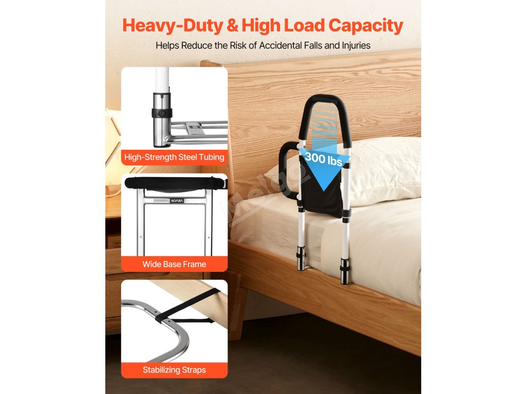 Přiložené popruhy bezpečně zajišťují zábradlí na místě a zabraňují jeho kývání nebo posouvání během používání. Prodloužený základní rám zvětšuje styčnou plochu a poskytuje stabilnější oporu.
