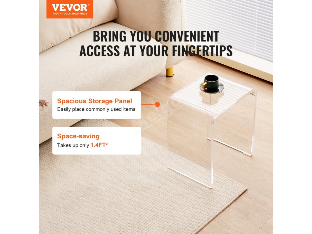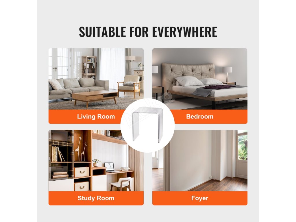 Akrylový koncový stolek ve tvaru písmene U je vyroben z přírodního akrylového materiálu. Jeho průhledné provedení vyzařuje křišťálově čistý lesk, který se hodí do různých stylů a prostorů v domácnosti. Díky 18mm zesílené desce poskytuje zvýšenou nosnost a nabízí stejnou stabilitu jako dřevěný stůl.