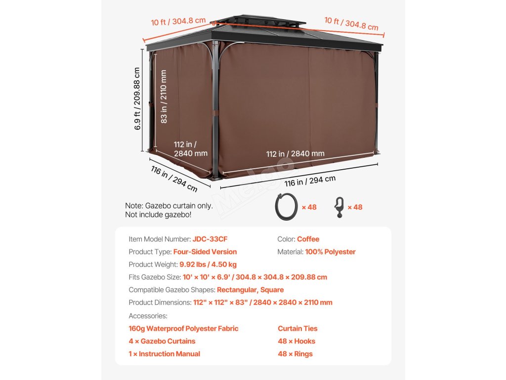 Tento závěs je určen pro altány o rozměrech 10' x 10' x 6,9' a je vyroben z voděodolného polyesteru o gramáži 160 g/m2, který nabízí odolnost a ochranu před sluncem Oboustranný zip umožňuje snadné nastavení a zajišťuje vaše soukromí. Hliníkové průchodky a třídílná konstrukce s vázacími pásky umožňují snadnou instalaci.