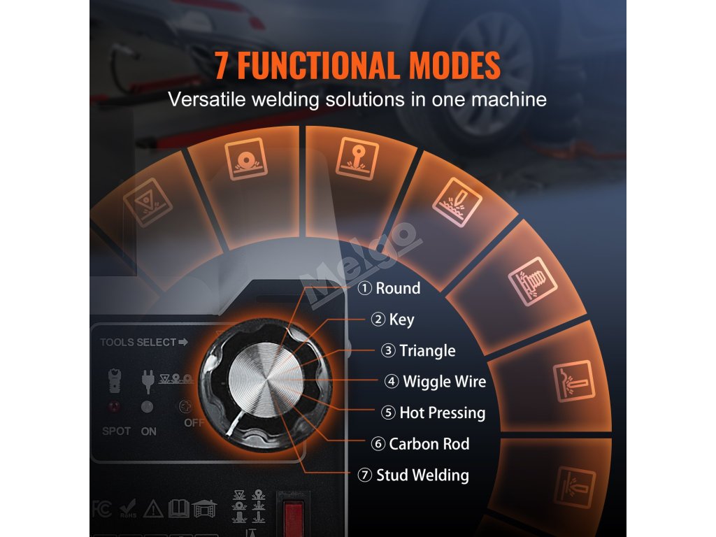 Děrovací svářečka karoserií VEVOR je vybavena 7 funkčními režimy včetně kulatého, OT, trojúhelníkového polštářku, svařování drátem, lisování za tepla, svařování uhlíkovou tyčí a svařování trnů. Vyhovuje různým potřebám oprav a poskytuje efektivní řešení pro uhlíkovou ocel, nerezovou ocel a železo.