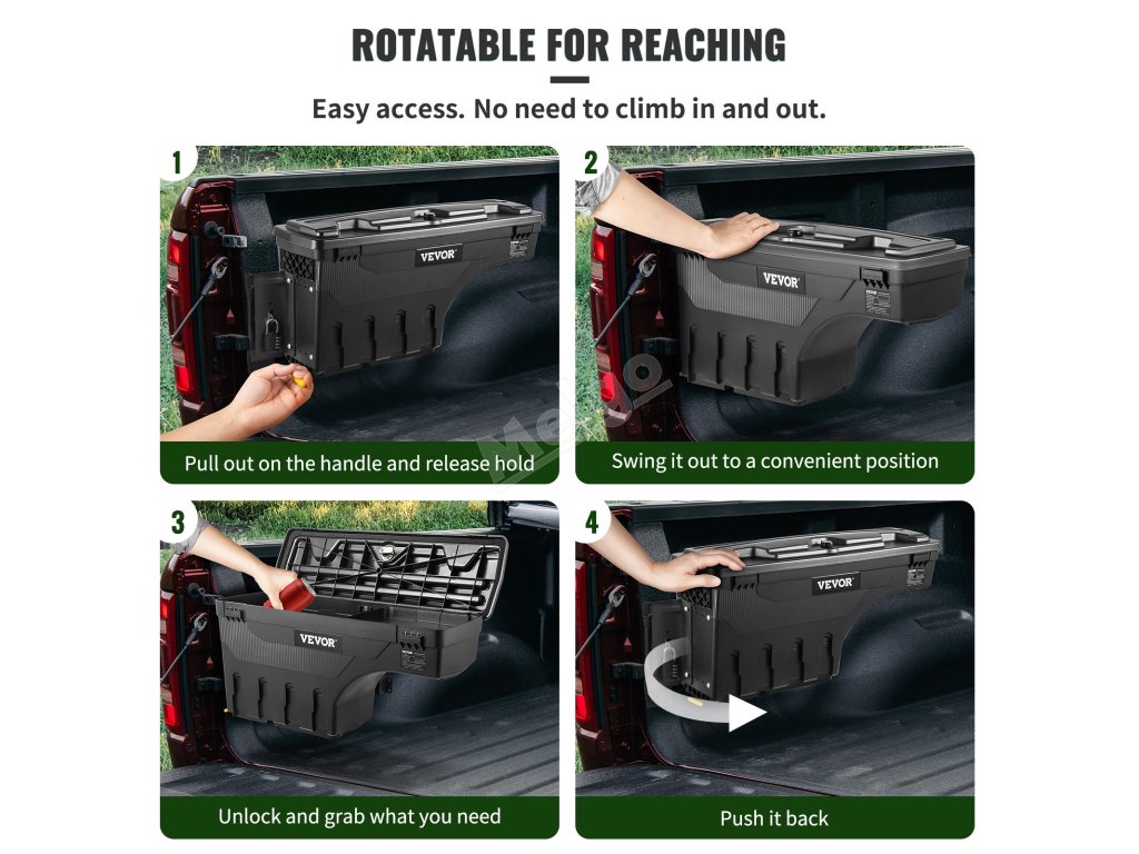 Úložný box můžete umístit do ložné plochy nákladního automobilu na straně řidiče nebo spolujezdce a získat tak dostatek prostoru pro své cestovní potřeby. Pohodlně se vysouvá a zasouvá. Není třeba lézt do lůžka, jak to vyžaduje většina boxů.