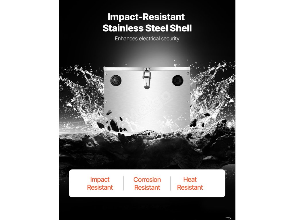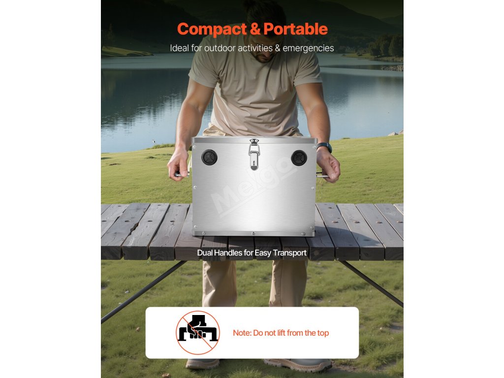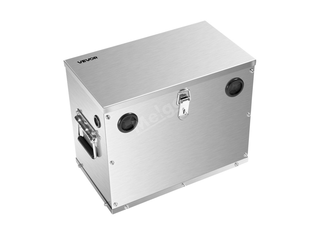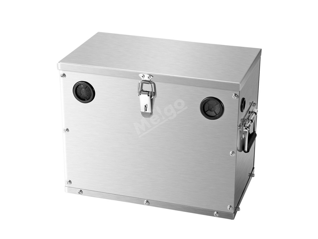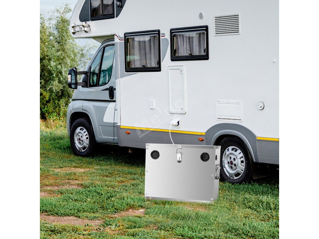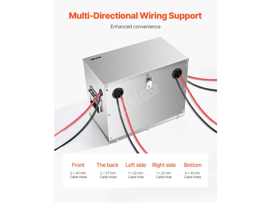 Tento bateriový box podporuje olověné, lithiové a AGM baterie 12V/24V/36V. Je vyroben z nerezové oceli 201 a je odolný vůči nárazům, teplu a drsným podmínkám. Je vybaven vícesměrnou kabeláží, zámkem pro zabezpečení a konstrukcí se dvěma držadly pro přenášení.