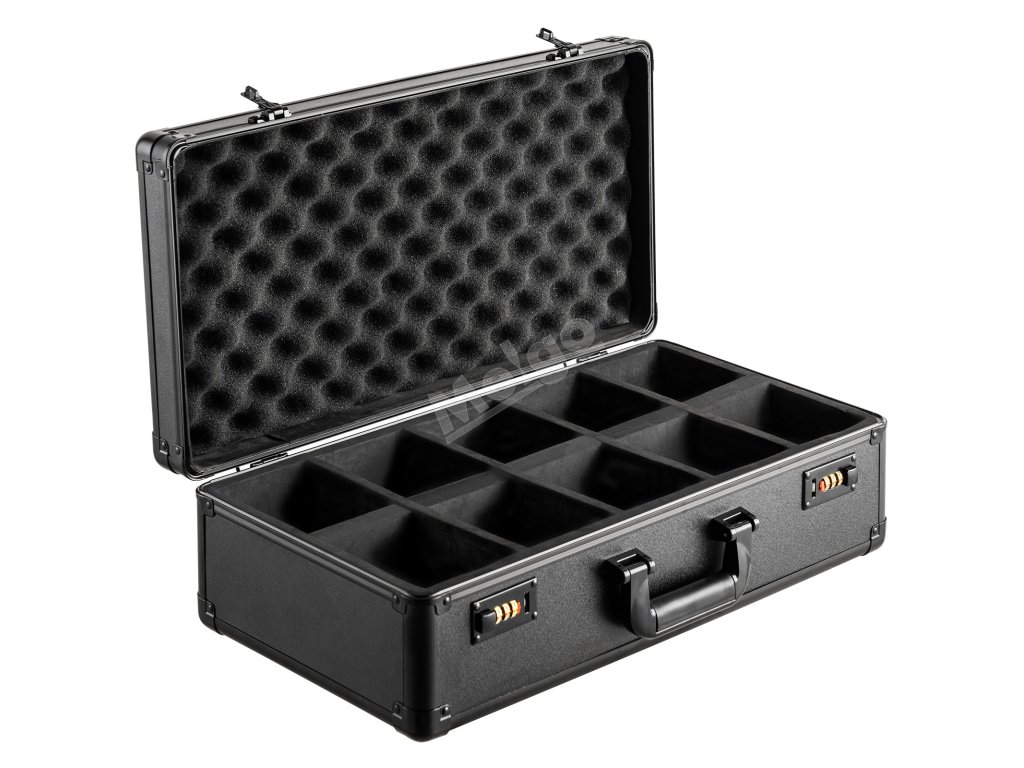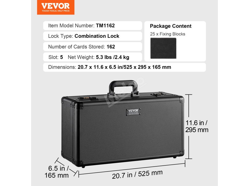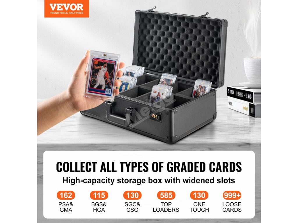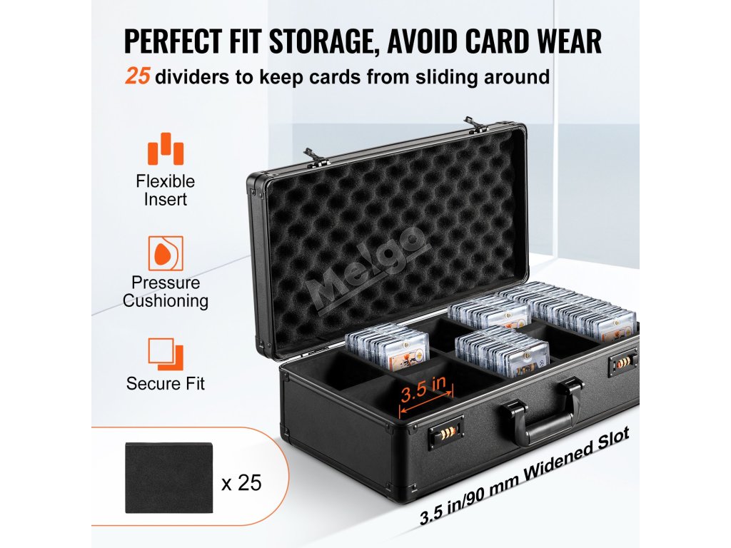 Představujeme vám naše pouzdro na karty s rozšířeným 3,5palcovým/90mm slotem na karty a 25 pružnými pěnovými vložkami, které pojme až 162 karet s hodnocením PSA a je kompatibilní se systémy PSA, BGS, SGC a TOP LOADERS. Díky kombinačnímu zámku a rukojeti ochráníte své karty a můžete si je s klidem vzít kamkoli s sebou!