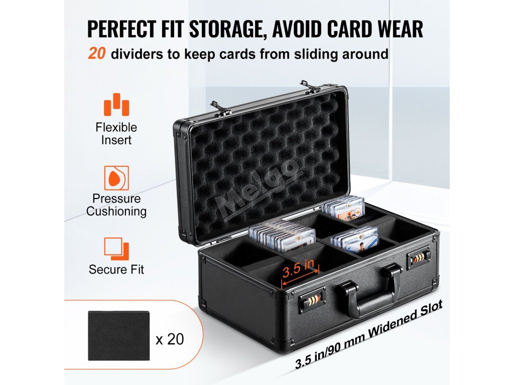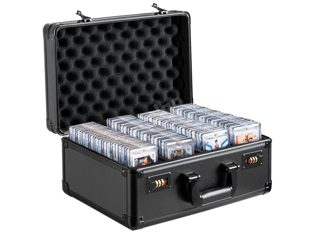 Představujeme vám naše pouzdro na karty s rozšířeným 3,5palcovým/90mm slotem na karty a 20 pružnými pěnovými vložkami, které pojme až 108 karet s hodnocením PSA a je kompatibilní s PSA, BGS, SGC a TOP LOADERS. Díky kombinačnímu zámku a rukojeti ochráníte své karty a můžete si je bez obav vzít kamkoli s sebou!