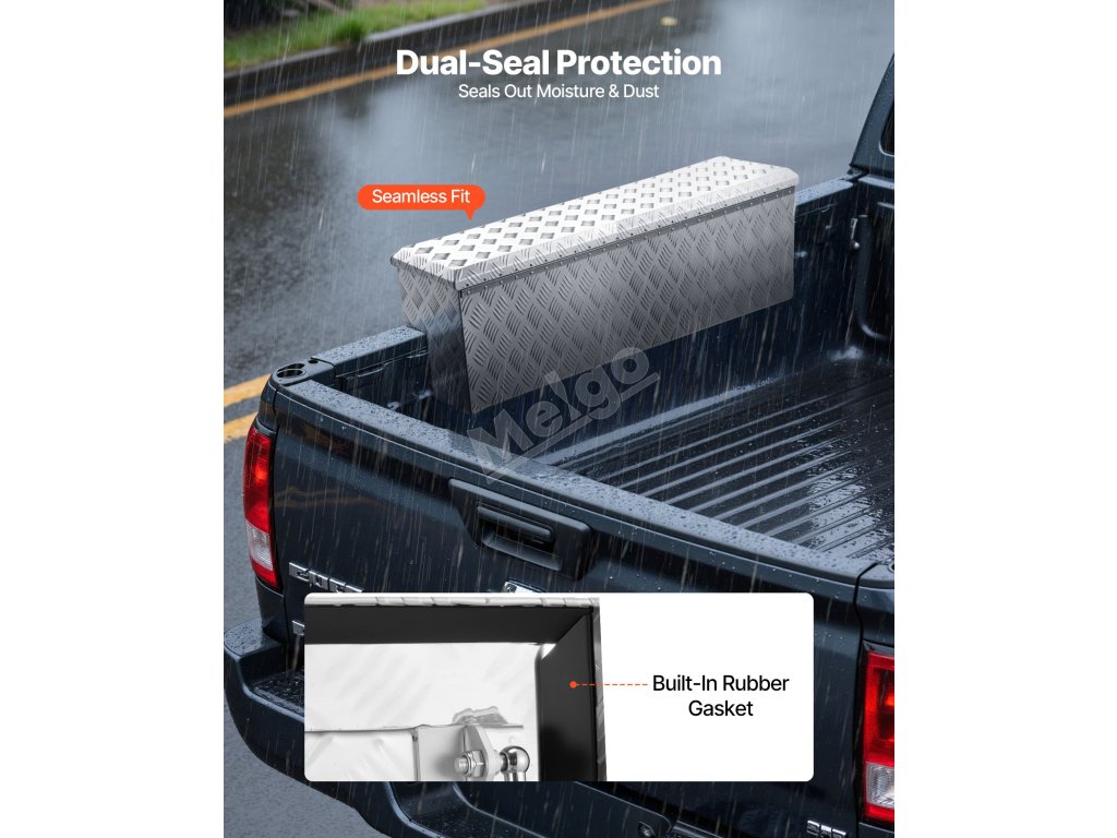 Tento box na nářadí pro nákladní automobily je vyroben z vyztužených kovových panelů o tloušťce 0,06 palce/1,4 mm a z vysoce pevného rámu z hliníkové slitiny s dezénem, který poskytuje vynikající odolnost proti opotřebení, korozi a korozi a zaručuje dlouhodobé používání.