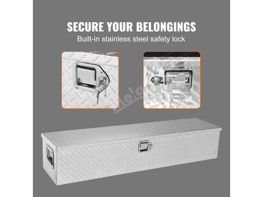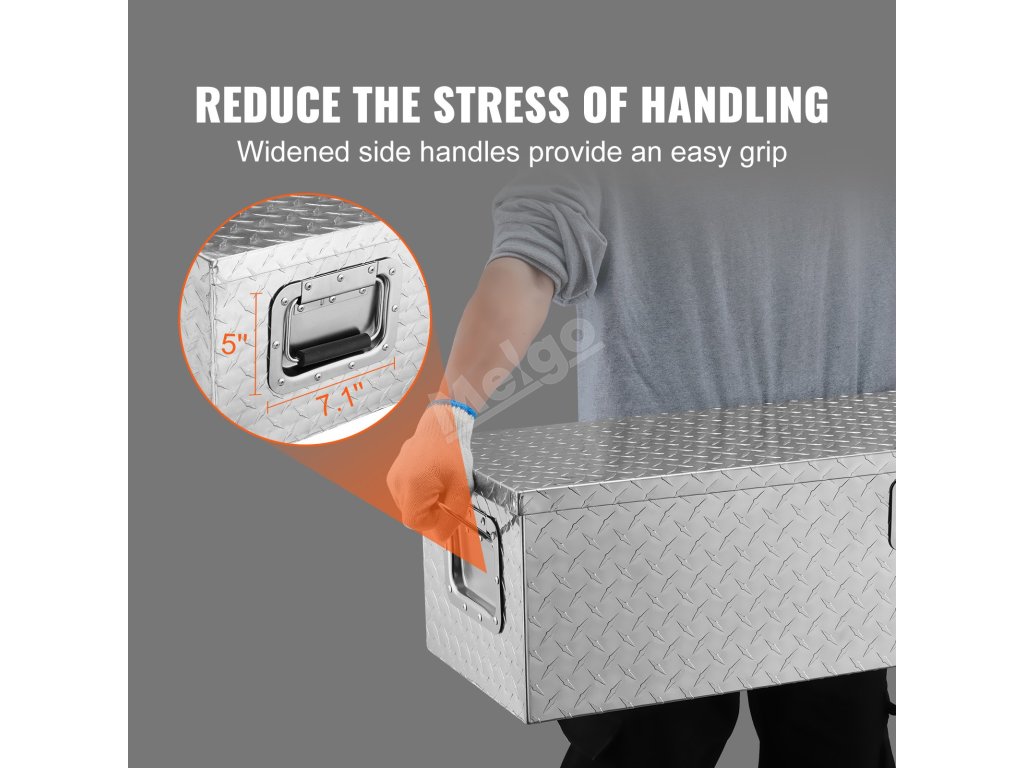 Box na nářadí je vyroben ze zesílené, vysoce kvalitní hliníkové slitiny, která je vodotěsná a odolná proti korozi. Jeho povrch s diamantovým vzorem je odolný proti opotřebení a prodloužené rukojeti usnadňují přenášení.