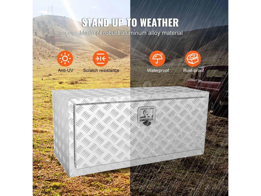 Je vyrobený z odolného hliníka. Tento materiál zaručuje, že box je pevný a zároveň odolný. Vydrží hrubé zaobchádzanie a náročné podmienky. Hliníkový diamantový plech zvyšuje jeho robustnosť. S hrúbkou steny 0,06 palca poskytuje dobrú ochranu pre vaše náradie. Naša nosnosť 110 libier znamená, že zvládne značnú hmotnosť. Môžete sa teda spoľahnúť na ukladanie ťažkých predmetov. Vysokokvalitná konštrukcia zaručuje dlhotrvajúci výkon. Môžete ho použiť ako spoľahlivé riešenie na uskladnenie rôznych potrieb.