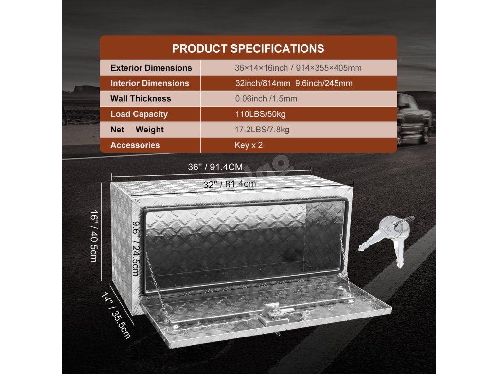 Tento podvozkový box na nákladné vozidlá je ideálny na zákazkové projekty s plochou ložnou plochou. Rozmery sú aj pod plochými lôžkami, čo vám poskytuje dostatok úložného priestoru. Tento rozmer 36 x 14 x 16 palcov dokonale vyvažuje priestor a kompaktnosť. Ľahko tak bezpečne uložíte náradie a vybavenie. Náradie alebo výbavu môžete ľahko upevniť. Konštrukcia tohto boxu umožňuje jeho montáž bez akýchkoľvek problémov. Jeho ľahká hliníková konštrukcia zaručuje bezproblémovú manipuláciu počas inštalácie. Tento podvozkový box pre nákladné vozidlá má interdisciplinárny charakter.