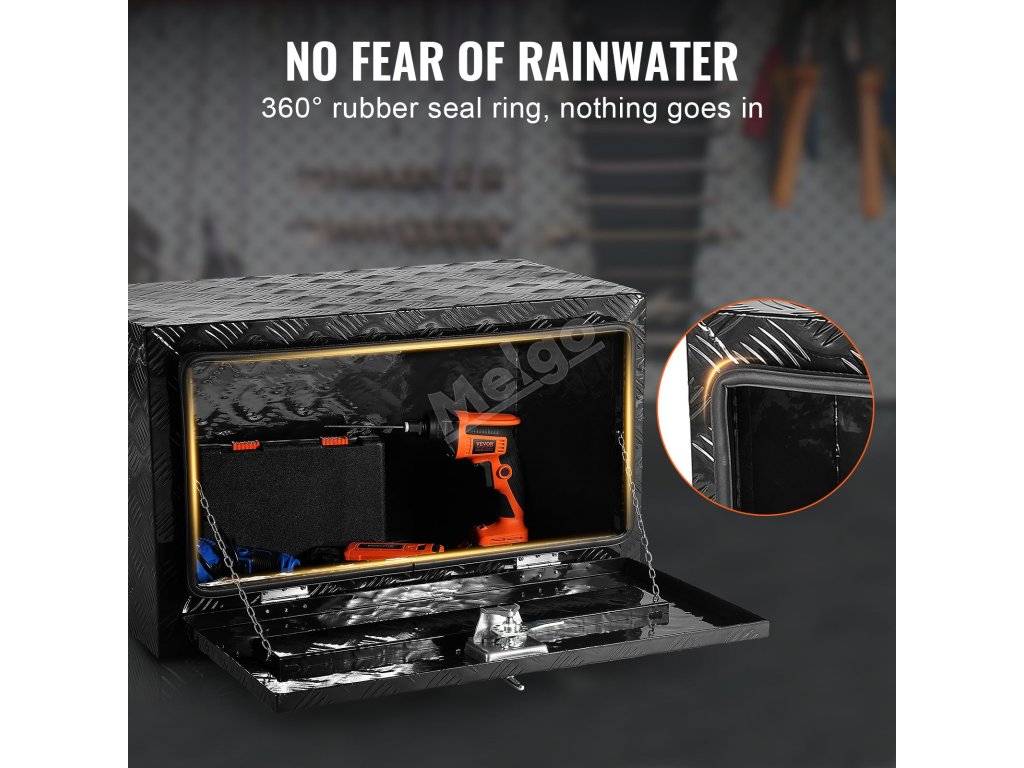 Vyrobeno ze zesíleného materiálu z hliníkové slitiny s povrchovým vzorem odolným proti poškrábání, který účinně zvyšuje odolnost a tvrdost; vybaveno 360° gumovým těsnicím proužkem uvnitř boxu na nářadí, který udržuje předměty v suchu a zabraňuje korozi a rzi.
