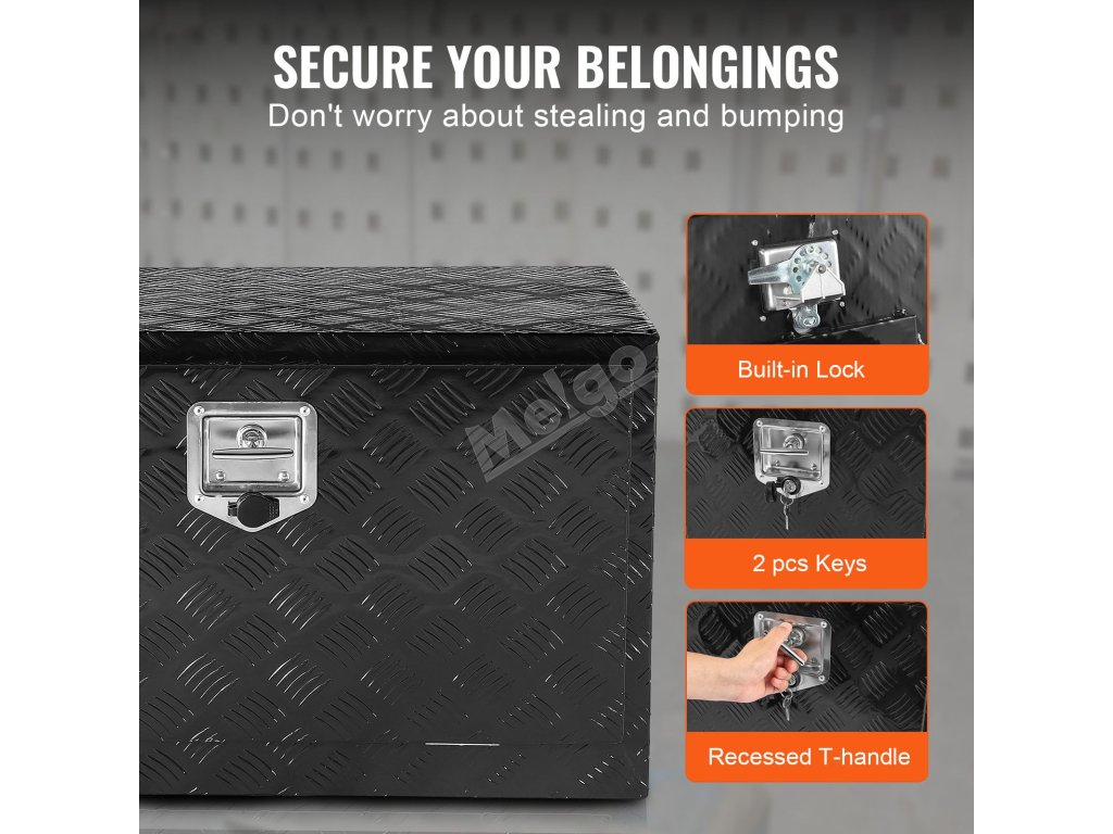 Box na nářadí je vybaven zámkem, pevnou západkou z nerezové oceli a dodává se se 2 exkluzivními klíči pro zvýšení bezpečnosti proti krádeži.