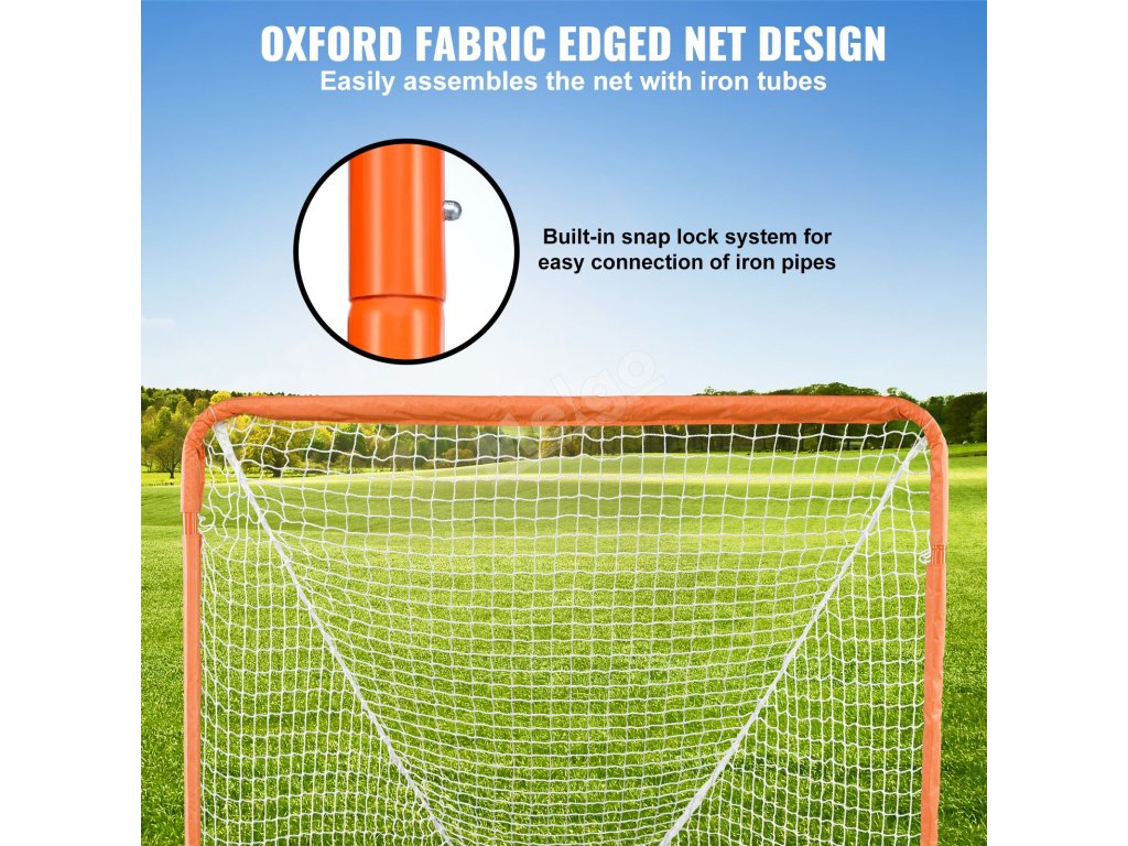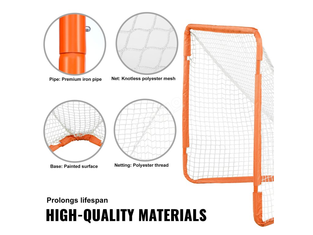 Toto lakrosové tréninkové vybavení je vyrobeno z kvalitních materiálů včetně robustních vysoce kvalitních železných trubek, silné polyesterové sítě bez uzlů, polyesterových šňůr a kovové základny.