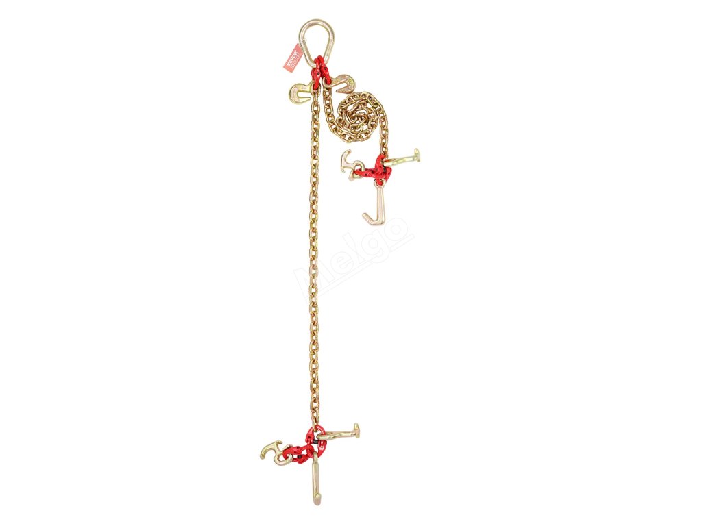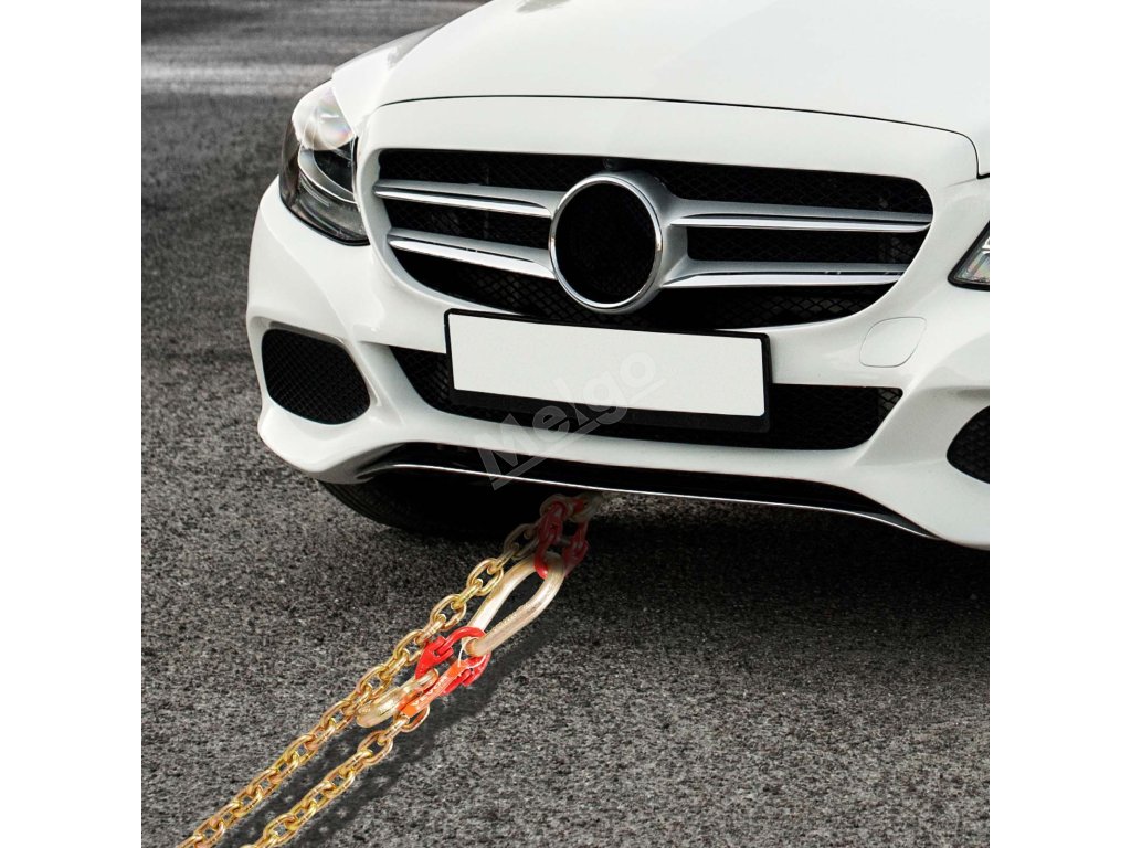 Tento vlečný řetěz s uzdečkou obsahuje několik háčků pro připevnění řetězu k různým typům vozidel.