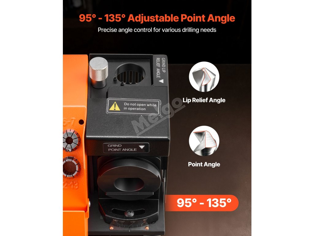 Nastavitelný úhel hrotu 95° - 135° pro různé typy vrtáků a dosažení přesných a konzistentních výsledků broušení.