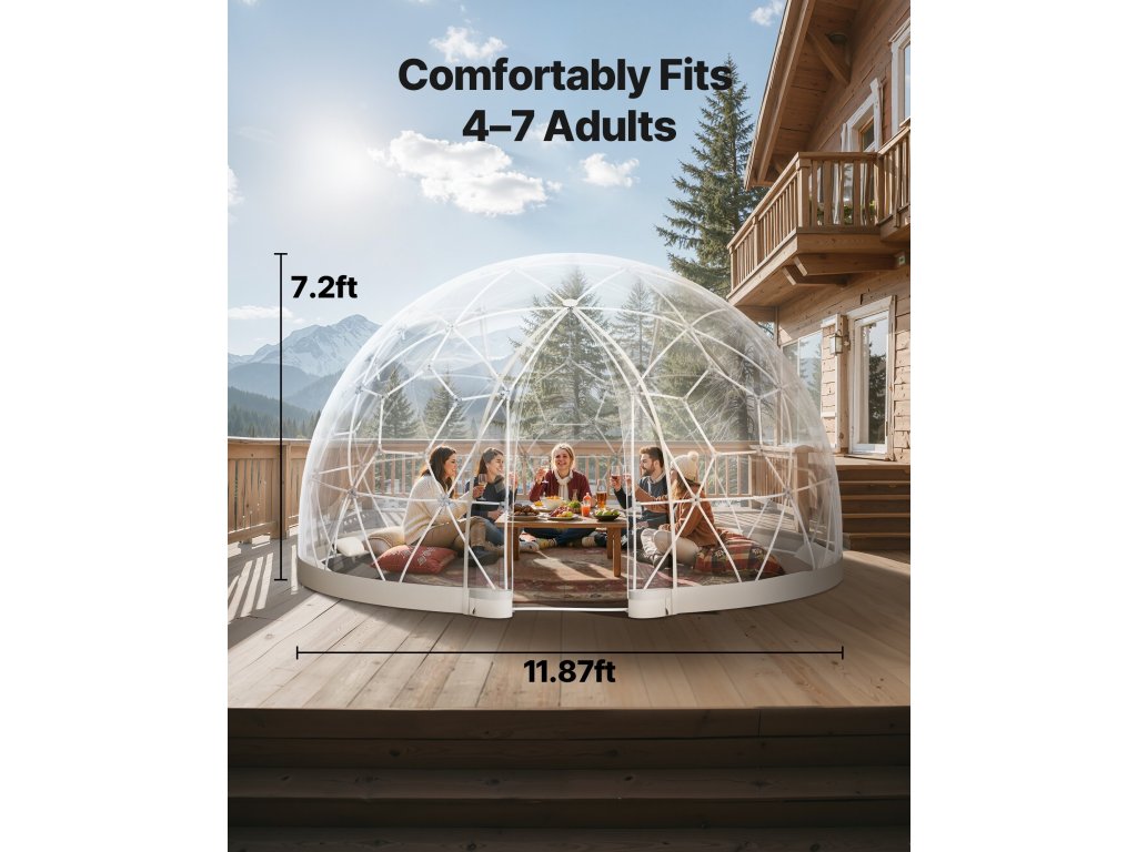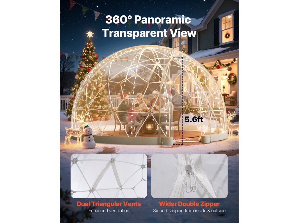 Užijte si celoroční pohodlí s tímto průhledným kopulovitým stanem typu iglú, který nabízí 360° panoramatický výhled, robustní konstrukci odolnou proti nepříznivému počasí a stylový design. Tento bublinkový stan je ideální pro zahrady, terasy nebo setkání - vaše útulné venkovní útočiště bez ohledu na roční období.