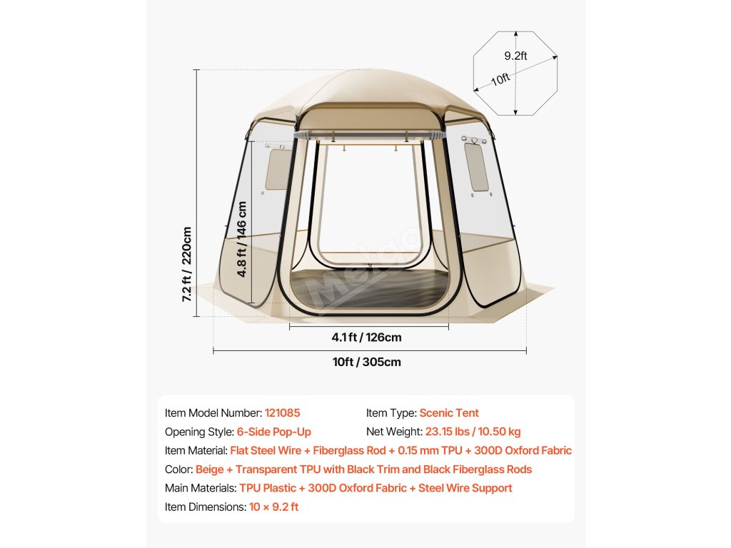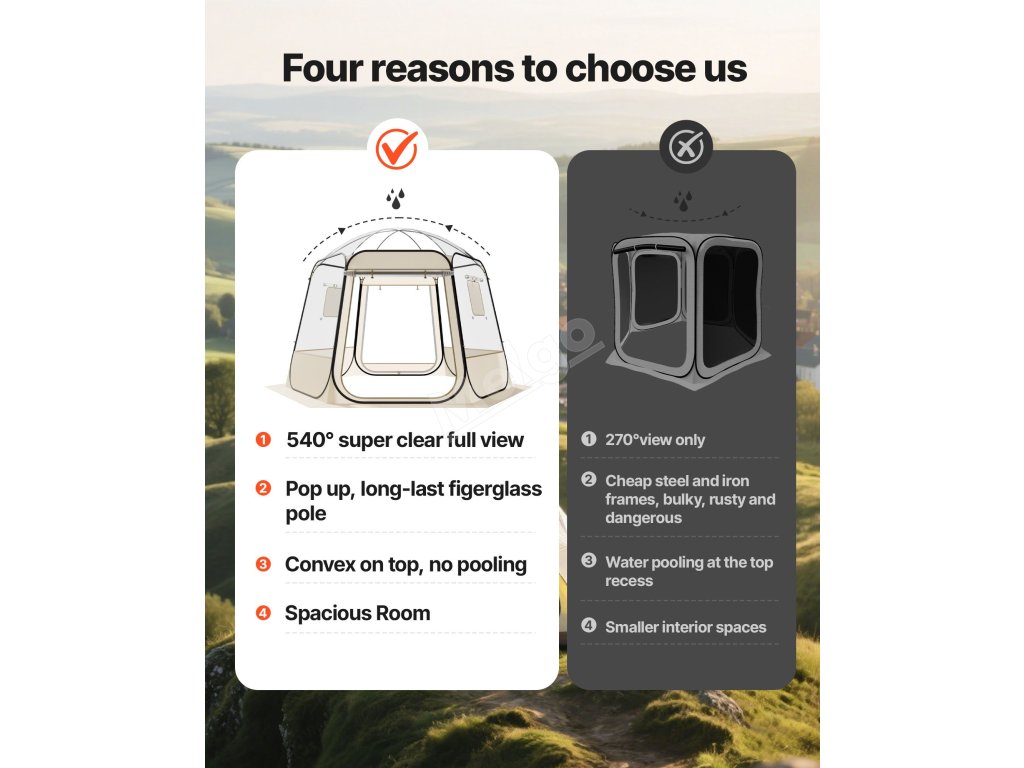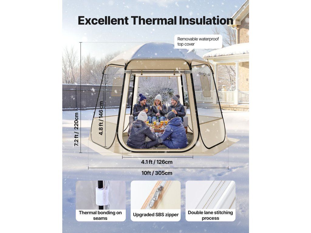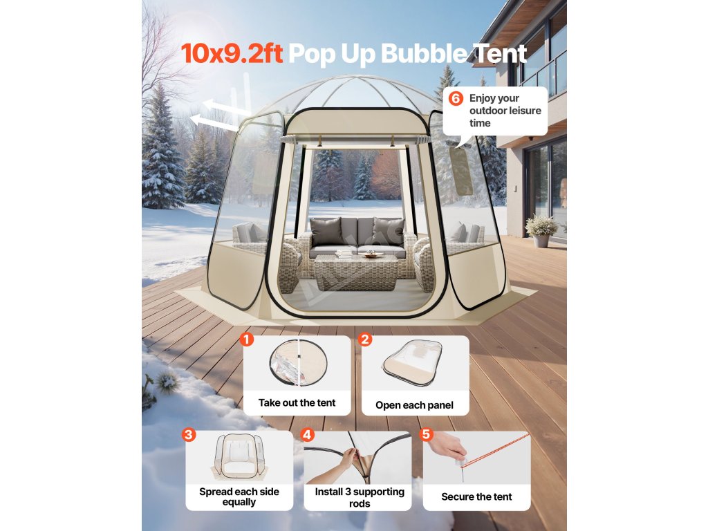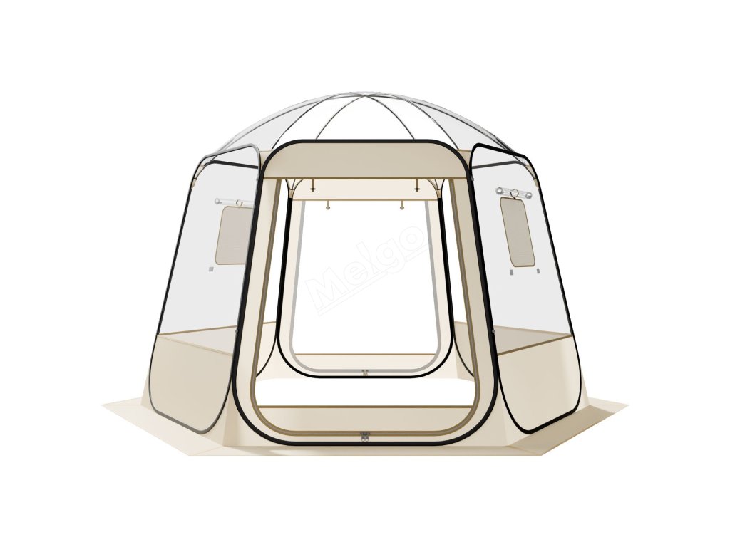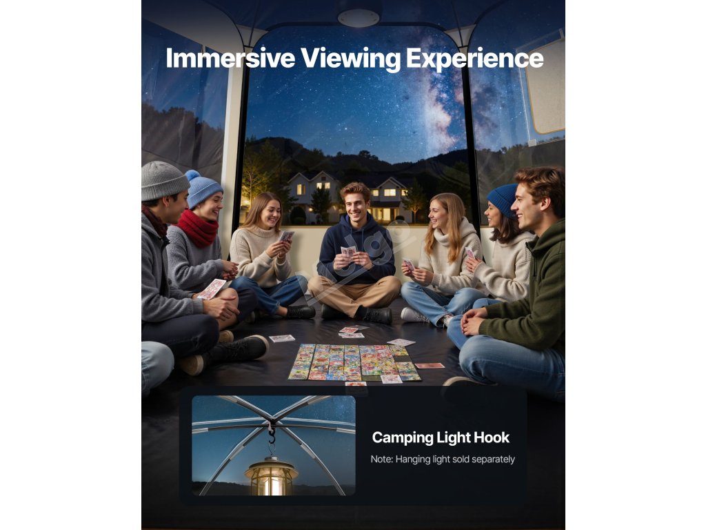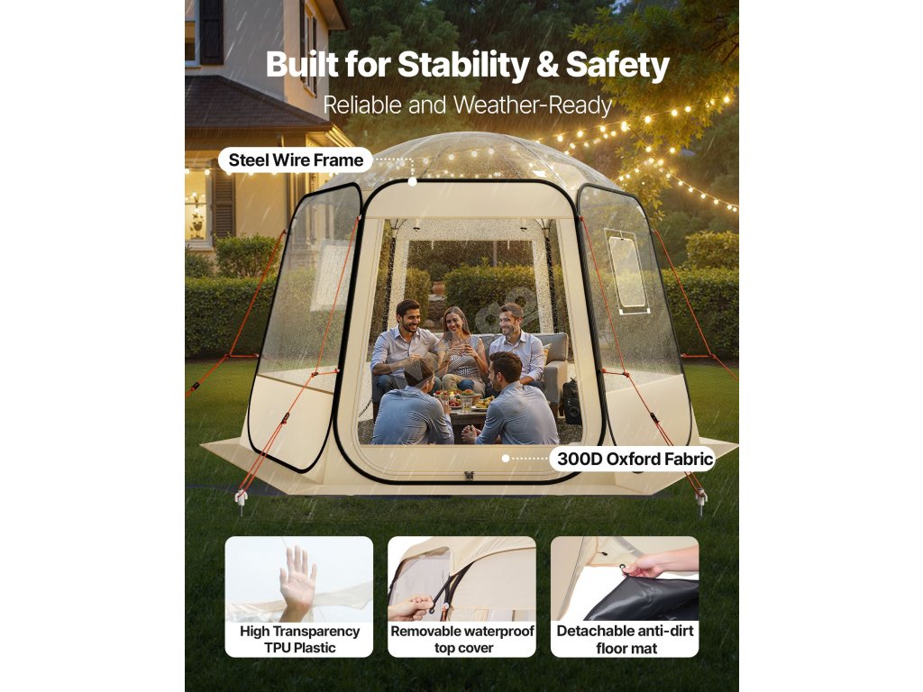 Tento pop-up bublinový stan pro 4-8 osob je vyroben z TPU a tkaniny 210D Oxford s ocelovým drátem pro zajištění stability a odolnosti. Pop-up konstrukce umožňuje rychlé sestavení během několika sekund, takže je ideální pro použití venku nebo na zahradě. Několik rolovacích bočních oken umožňuje snadnou regulaci proudění vzduchu a soukromí.