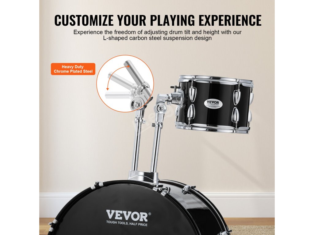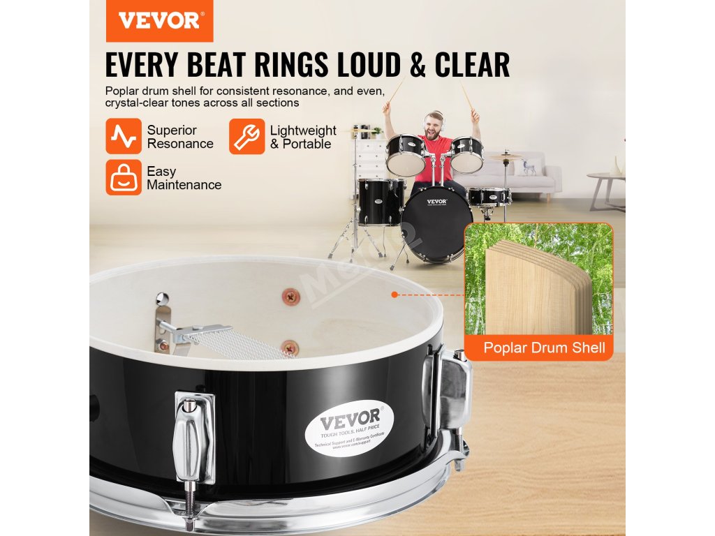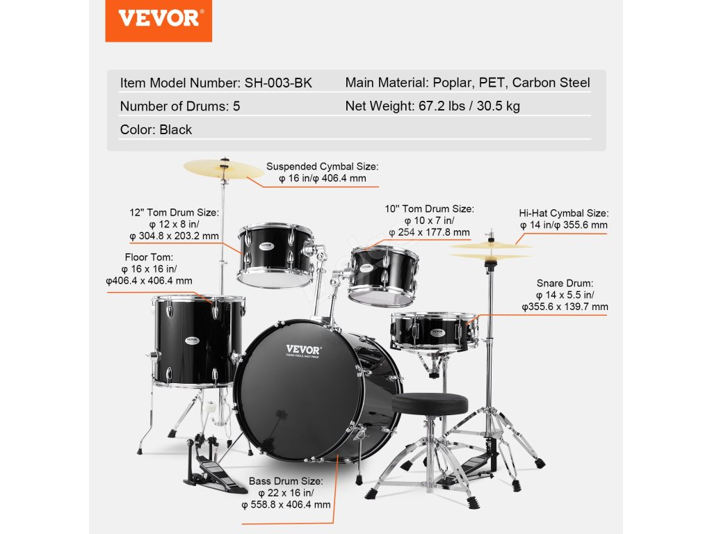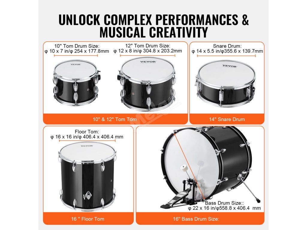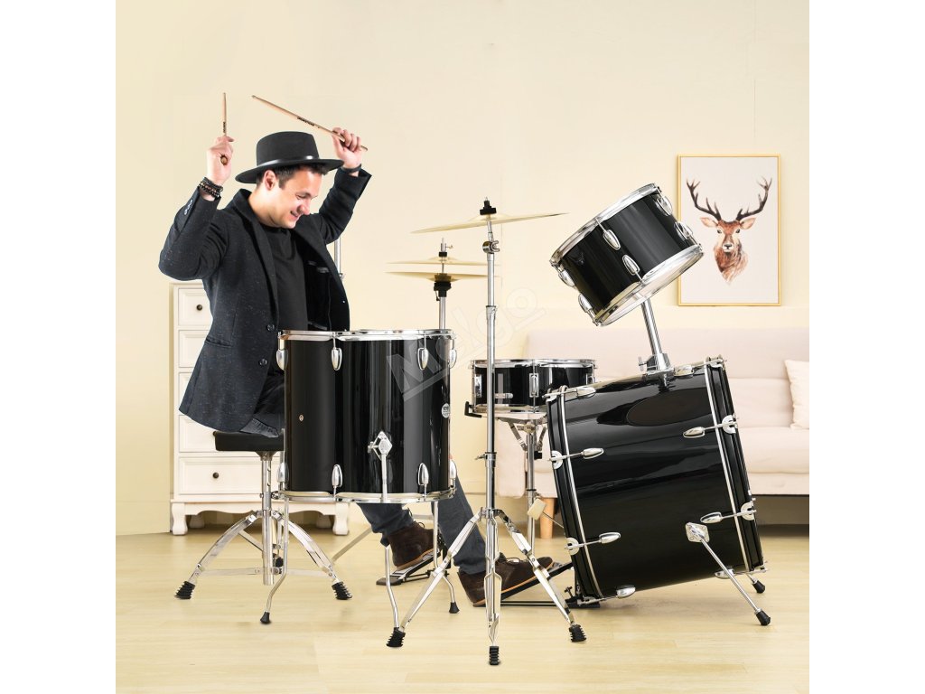 Naše bicí souprava pro dospělé obsahuje 10'' tom tom, 12'' tom tom, 14'' snare buben, 22'' basový buben a 16'' floor tom. Díky topolovému korpusu a PET bubenické hlavici mají naše bubny čistý a dynamický zvuk. Pozvedněte svou bubenickou cestu ještě dnes!