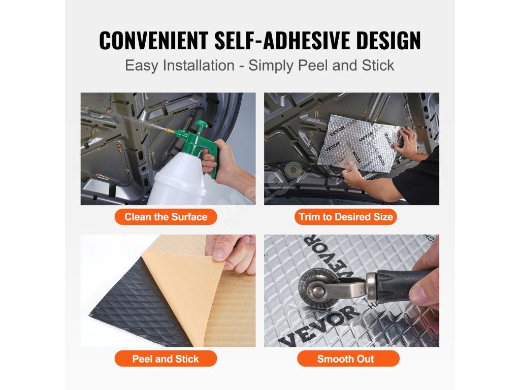 Naše sady zvukově izolačních rohoží jsou vybaveny vysoce pevným lepidlem, které nevyžaduje dodatečnou ruční aplikaci. Stačí odlepit podkladový papír a podložka bude pevně držet při vysokých i nízkých teplotách.
