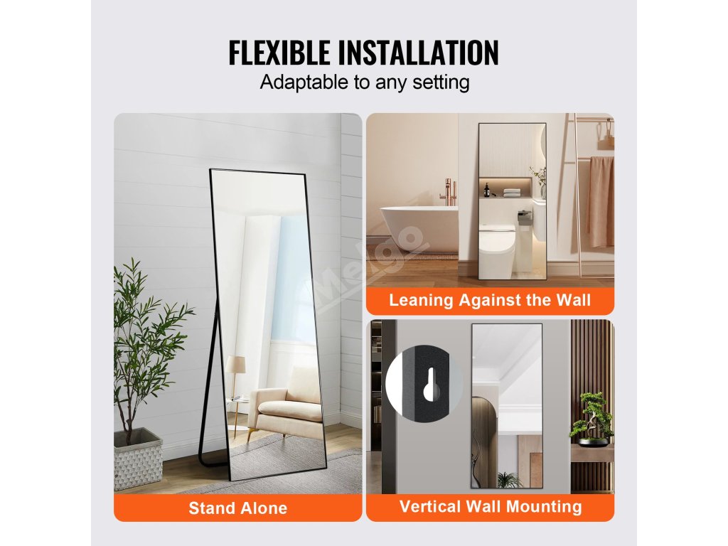 Naše dlouhé zrcadlo do obývacího pokoje nabízí několik možností instalace, takže ho můžete flexibilně naklonit ke stěně, zavěsit pomocí háčků na zadní straně nebo použít stojan a umístit ho kamkoli si přejete.