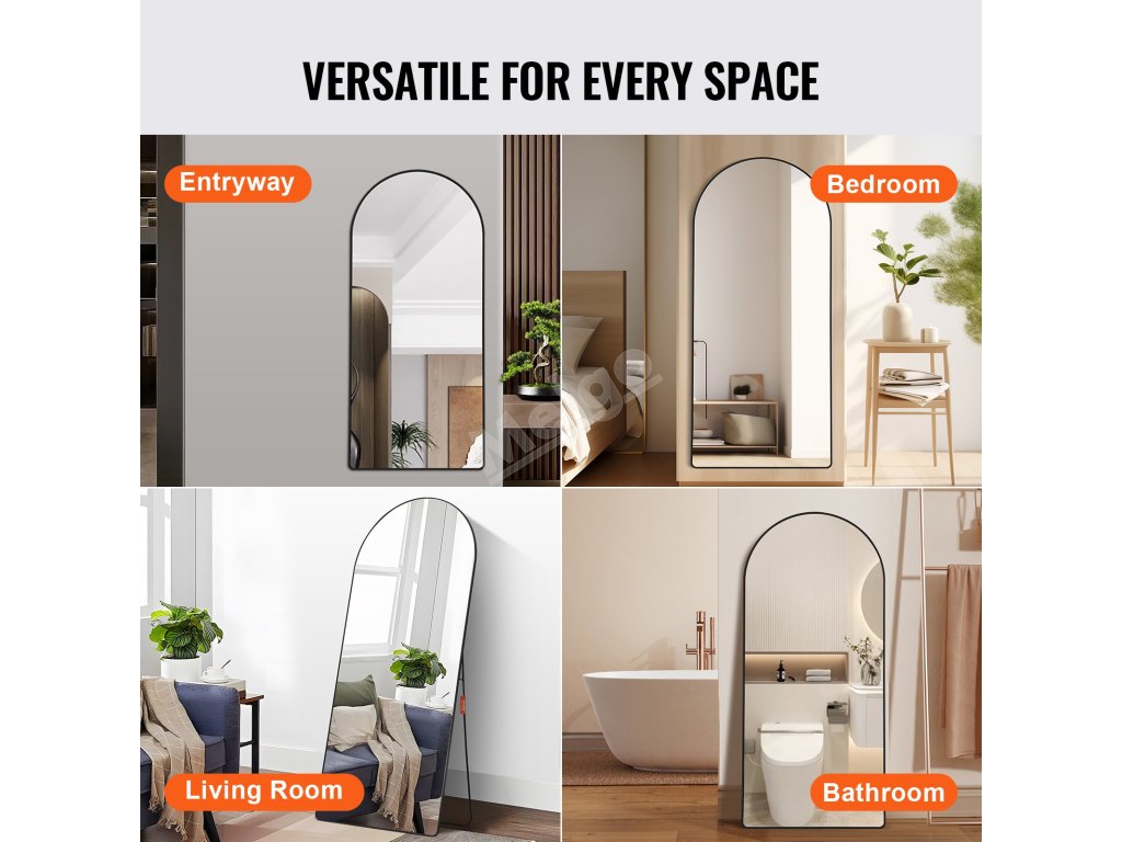 Naše nadrozměrné obloukové podlahové zrcadlo nabízí několik možností instalace, takže ho můžete flexibilně naklonit ke zdi, zavěsit pomocí háčků na zadní straně nebo použít stojan a umístit ho, kamkoli si budete přát.