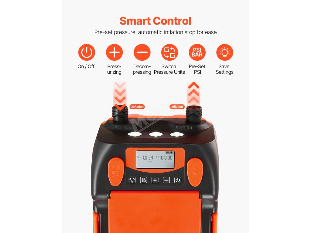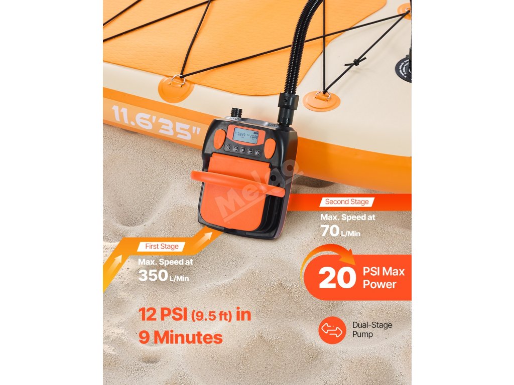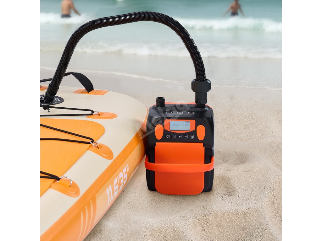 Tato elektrická pumpa na paddleboard, určená pro outdoorové nadšence, nafoukne paddleboard na tlak 12 PSI (9,5 ft) za 9 minut. Je vybavena digitálním displejem, paměťovou funkcí, baterií s kapacitou 6000 mAh a integrovaným úložným prostorem pro kabel, takže je vhodná pro cestování a kempování.